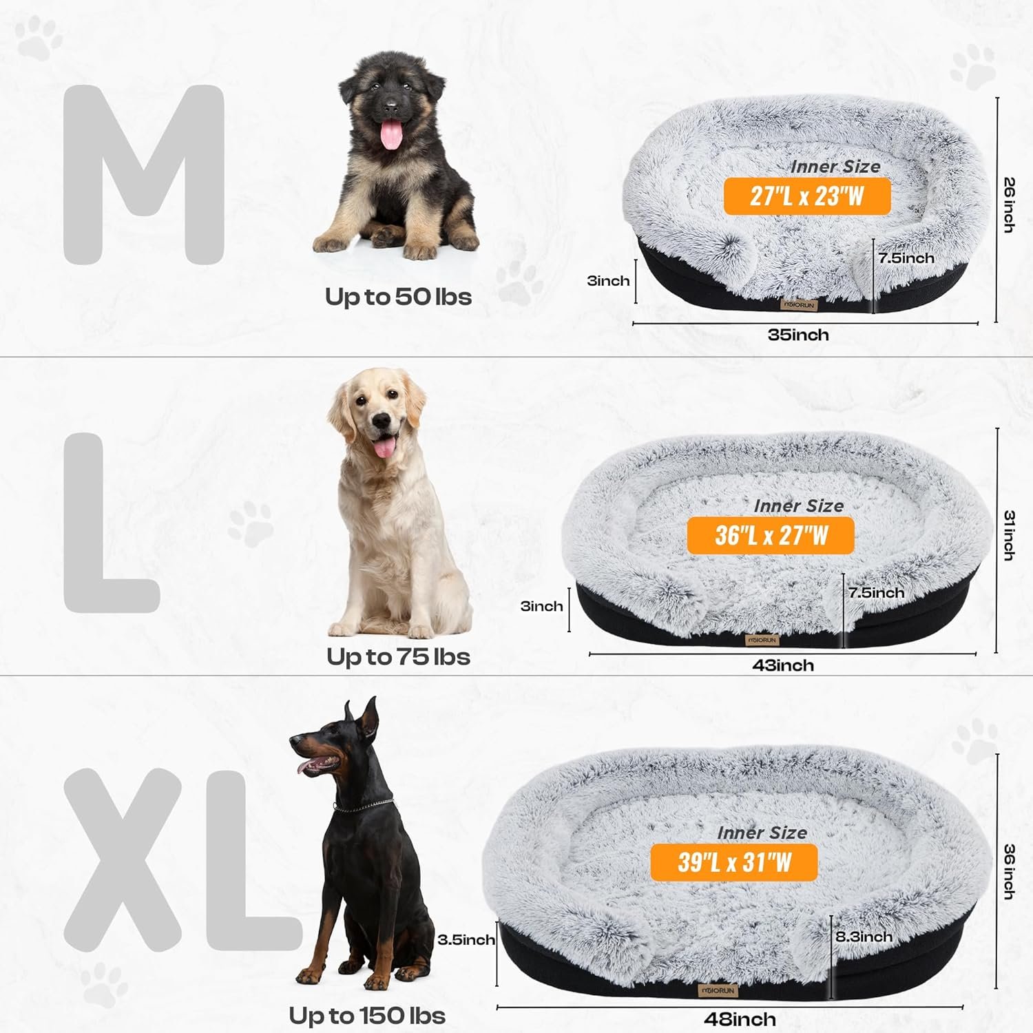 Fluffy Orthopedic Dog Bed for Medium & Large Dogs, Calming Plush Sofa Bed with Curved Bolster Support and Egg-Crate Foam Base, 43″ Cozy Oval Pet Donut Bed with Washable Cover, Gray