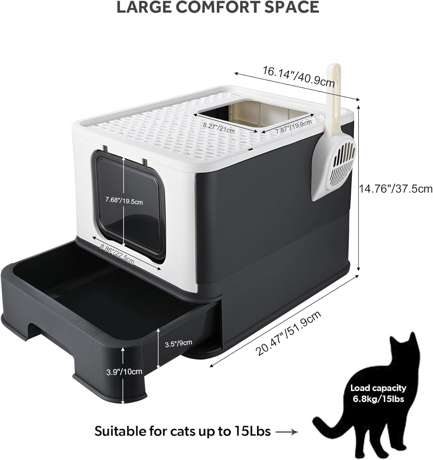 【Large Litter Box with Lid】This litter box has plenty of space inside. Overall dimensions: 20.47 “L x 16.14 “W x 14.76″H, top exit: 8.3″ x 7.8″, front door entrance: 8.86″ x 7.68”. Spacious interior provides plenty of room for cats up to 15 lbs.