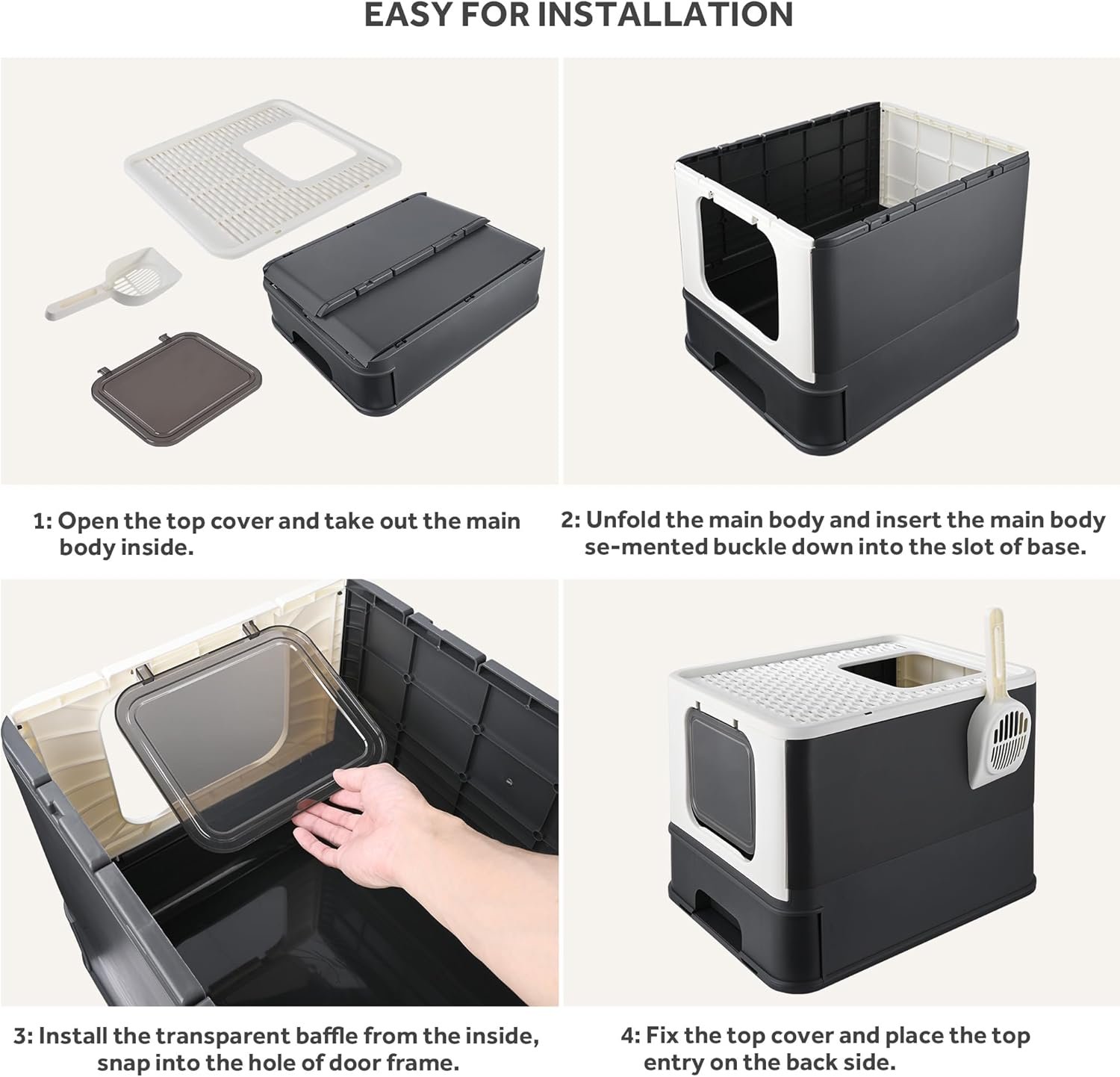 【Easy to Use】Our kitty litter box is easy to assemble and easy to maintain. To move freely without restriction. Completely enclosed high-sided litter box protects the cat’s privacy, reduces house odor and keeps the air fresh.