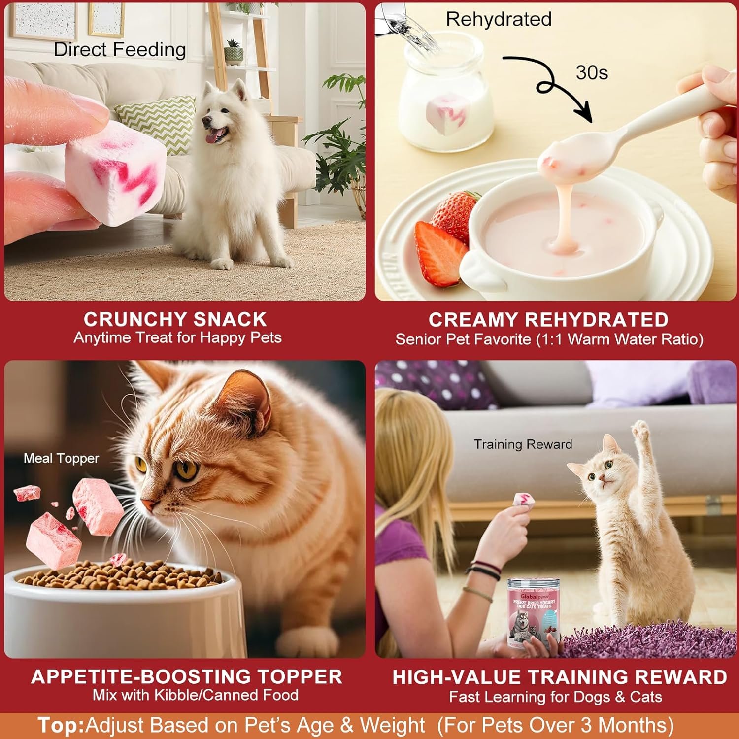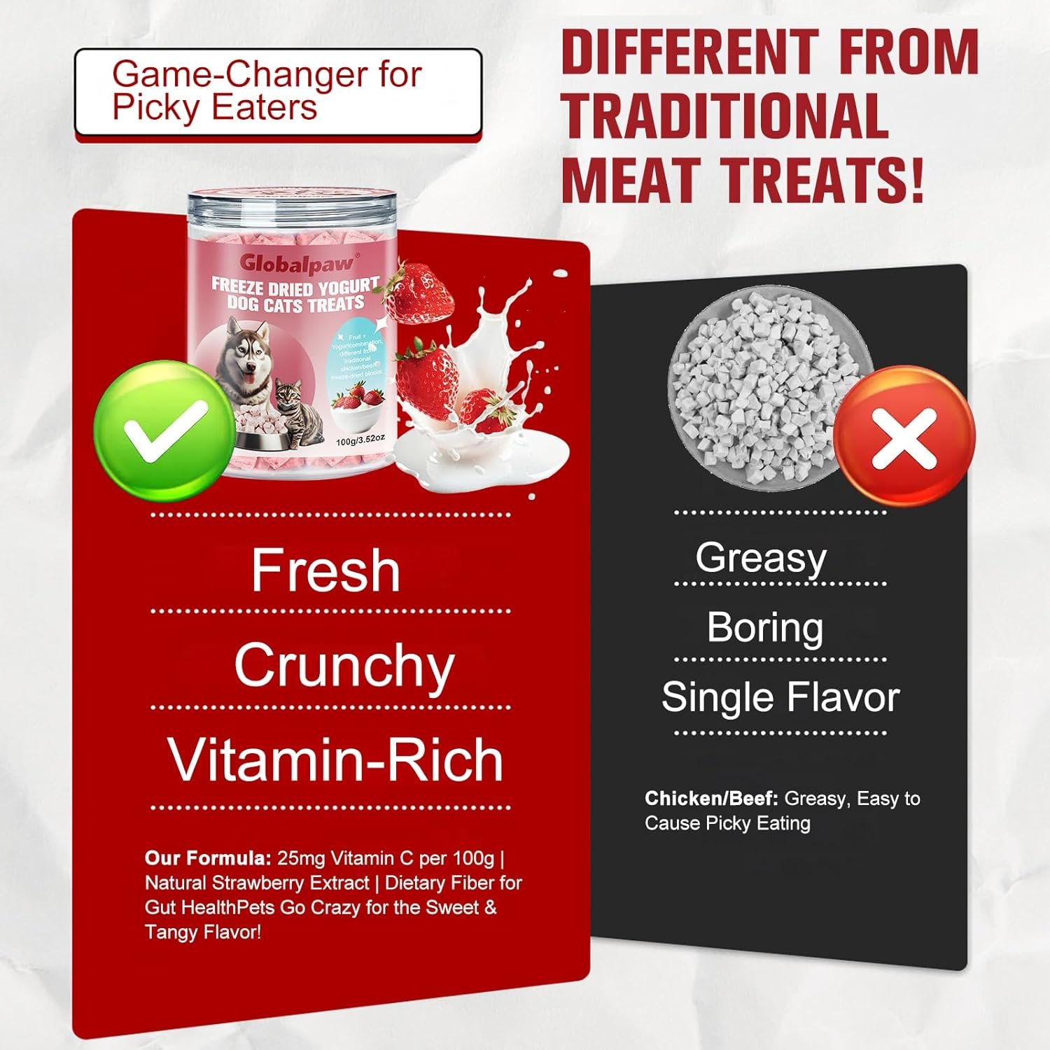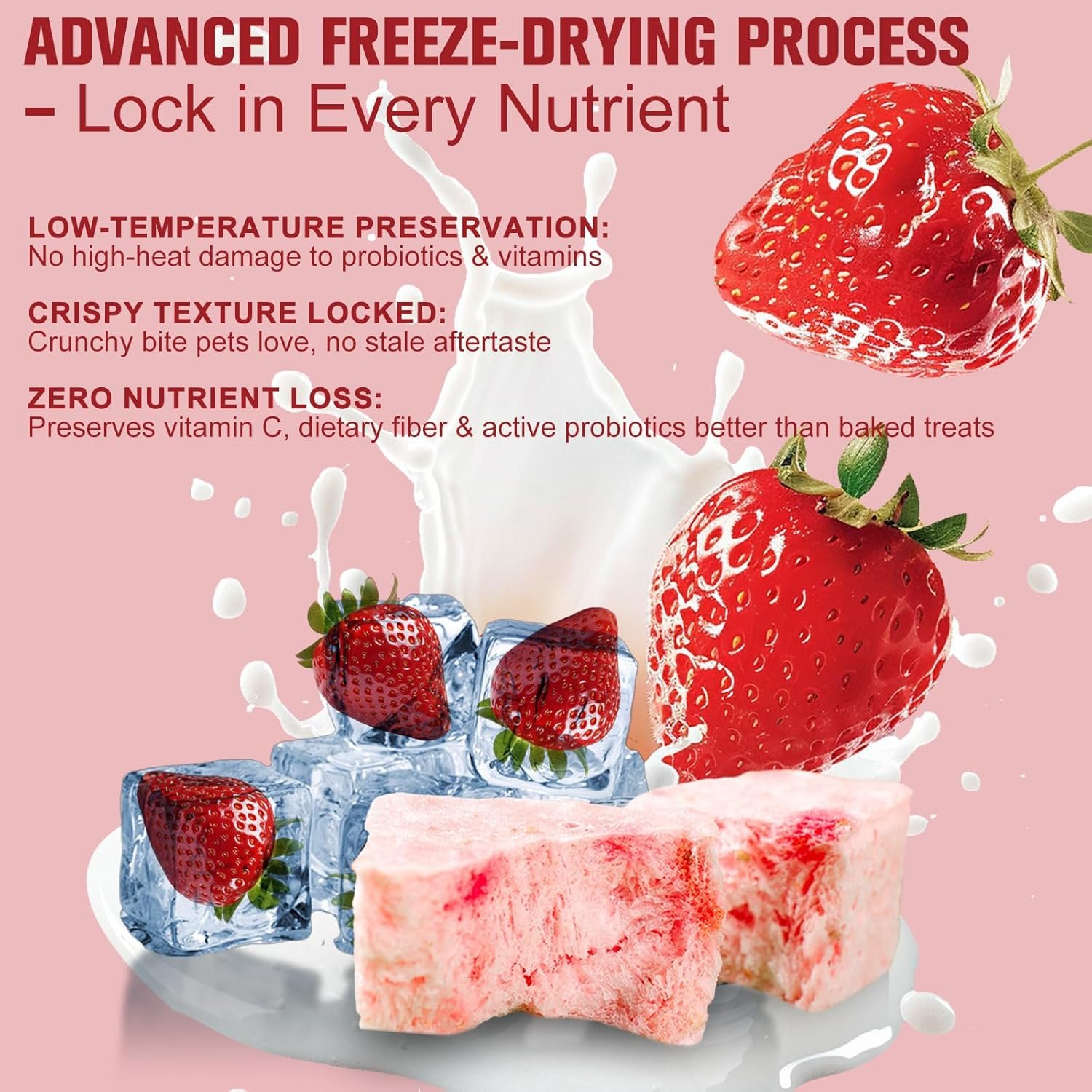 🍓【Unique Fruit + Yogurt Blend – No Chicken/Beef】:Perfect for Picky & Sensitive PetsTired of greasy meat-based freeze-dried treats that your pet gets bored of? Our strawberry-yogurt formula is a game-changer! Packed with 25mg vitamin C per 100g and natural dietary fiber, it boosts intestinal health while satisfying your pet’s craving for something sweet and crunchy. Ideal for pets with meat allergies or picky eaters who turn up their nose at traditional snacks.