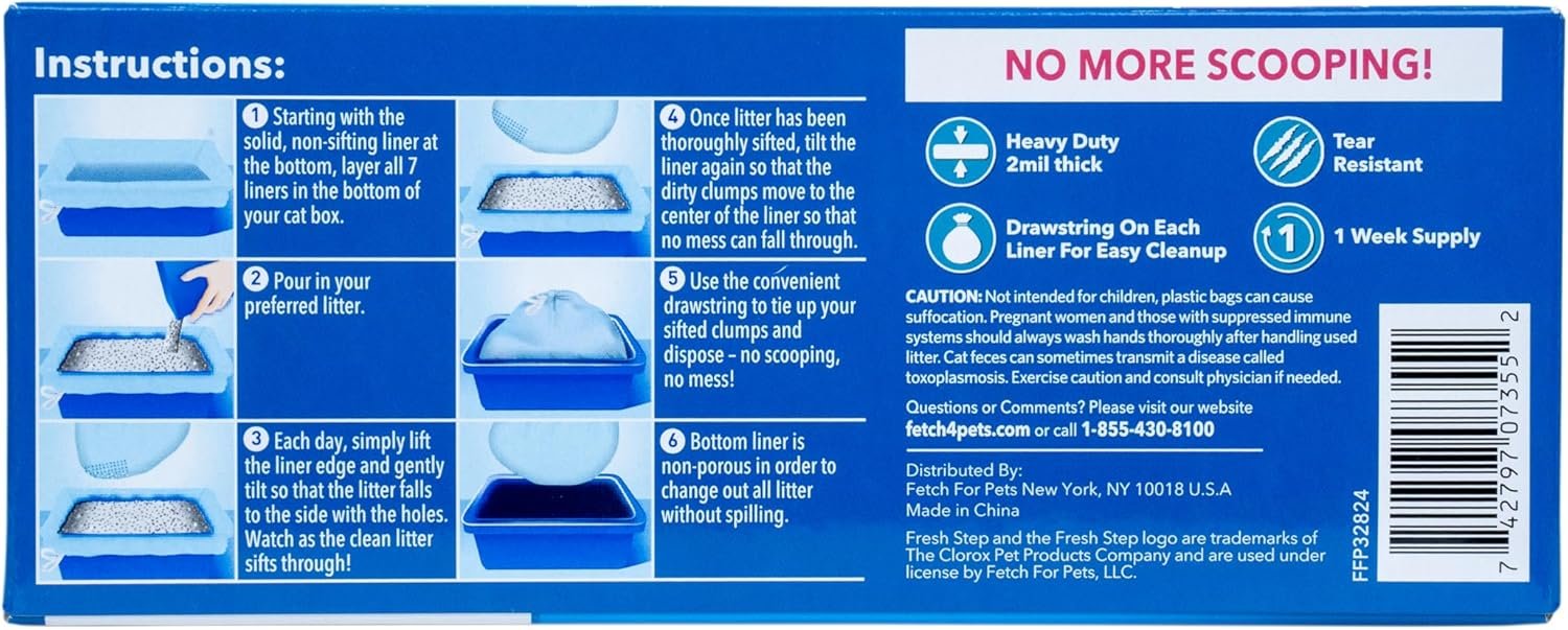 Say goodbye to scooping and hello to effortless cleanup with Fresh Step Sifting Litter Box Liners! Designed for ultimate convenience, these cat litter sifting bags make maintaining your cat’s litter box a breeze. With their jumbo size (36” x 19”), they fit most rectangular and oval litter boxes perfectly, while the lift-and-sift design efficiently separates dirty clumps from clean litter. Made with heavy-duty, tear-resistant material, these litter box liners are built to handle the daily demands of cat life. Each liner is 2 millimeters thick for added durability and features a drawstring for quick, mess-free disposal. Plus, the Fresh Scent keeps your home smelling clean and inviting. Transform your litter box routine with the effortless efficiency of Fresh Step Sifting Litter Box Liners and the 7-day sifting method: Instructions: 1. Starting with the solid, non-sifting liner at the bottom, layer all 7 liners in the bottom of your cat box. 2. Pour in your preferred litter. 3. Each day, simply lift the liner edge and gently tilt so that the litter falls to the side with the holes. Watch as the clean litter sifts through! 4. Once litter has been thoroughly sifted, tilt the liner again so that the dirty clumps move to the center of the liner so that no mess can fall through. 5. Use the convenient drawstring to tie up your sifted clumps and dispose – no scooping, no mess! 6. The bottom liner is non-porous in order to change out all litter without spilling.
