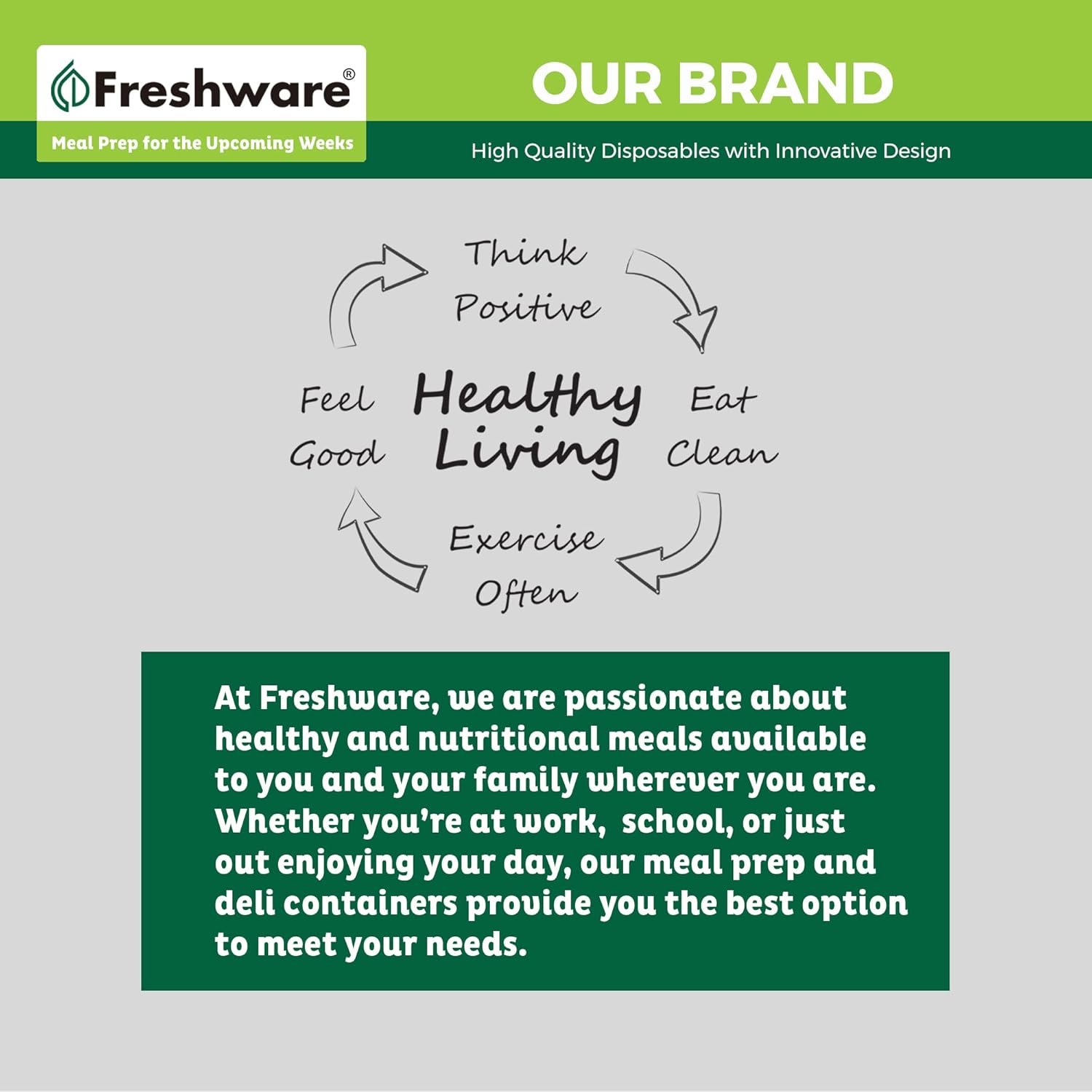 The Ultimate Food Storage Containers for Your Kitchen is Here! At Freshware we create convenient solutions for the health-conscious individual. From our deli containers, plastic containers, meal prep containers, deli cups, premium bento boxes, and more! 50-Set 12 oz Deli Containers With Lids These deli containers are ideal for use at home and food services. Excellent for storing soups, stews, deli foods like chicken or macaroni salad, nuts, and small quantities of many other food items. Airtight Seal Easy to close leak-proof lids form an airtight seal to ensure long lasting freshness and prevent freezer burn. Take these containers directly from the fridge to the microwave for food that tastes just as fresh as the day it was made! BPA-Free and Microwavable Made of high-quality BPA, Phthalate free plastic which ensures strength, sturdiness, and flexibility. These plastic containers are 100% microwavable, no worries of harmful chemicals getting into your food. Meal Prep Portion Control Perfect, convenient size to use as a weight loss aid for portion control. Make your meal prep easier and faster, to help you stay on track with healthy eating habits. Stackable and Freezer Safe Stackable and space saving in many spaces, such as: refrigerators, freezers, lockers, coolers, gym bags and handbags. Reusable and Dishwasher Safe Simply place the containers into your dishwasher or wash by hand. Ideal for packing small, to go food items for travel purposes.