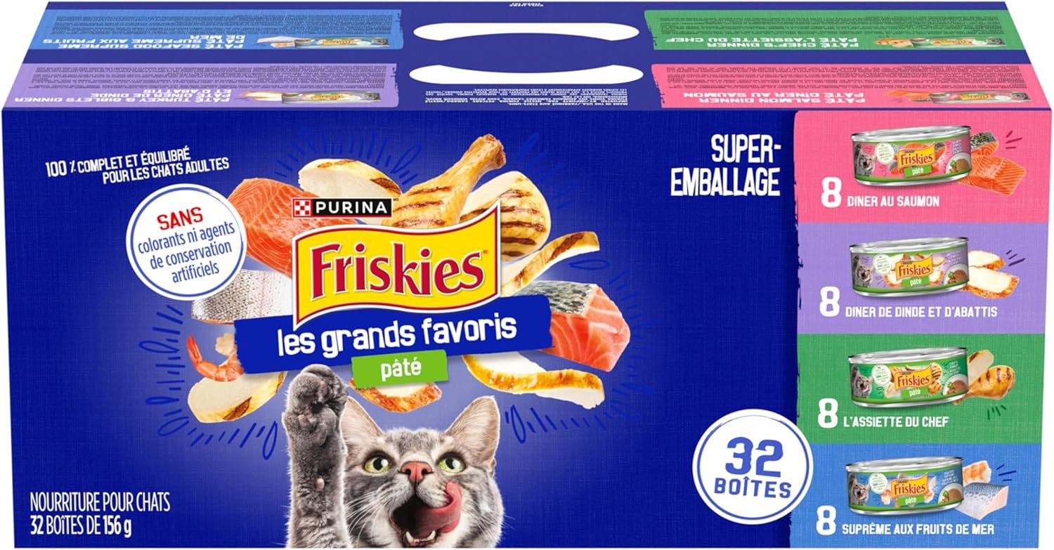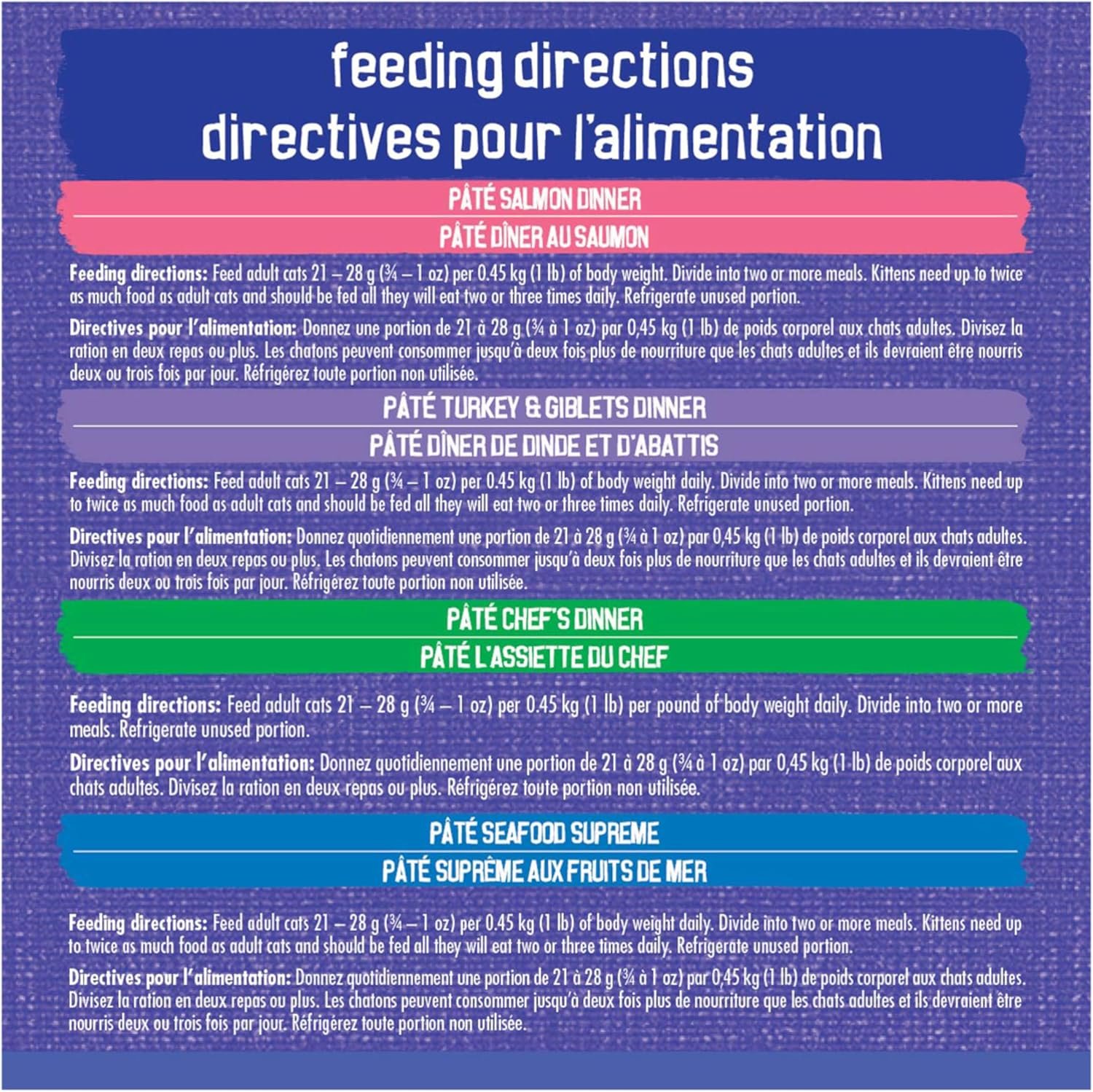 Finely ground and delightfully smooth pate assortment. Contains 8 x Friskies Pate Salmon Dinner, 8 x Friskies Pate Chef’s Dinner, 8 x Friskies Pate Seafood Supreme, and 8 x Friskies Pate Turkey & Giblets Dinner.