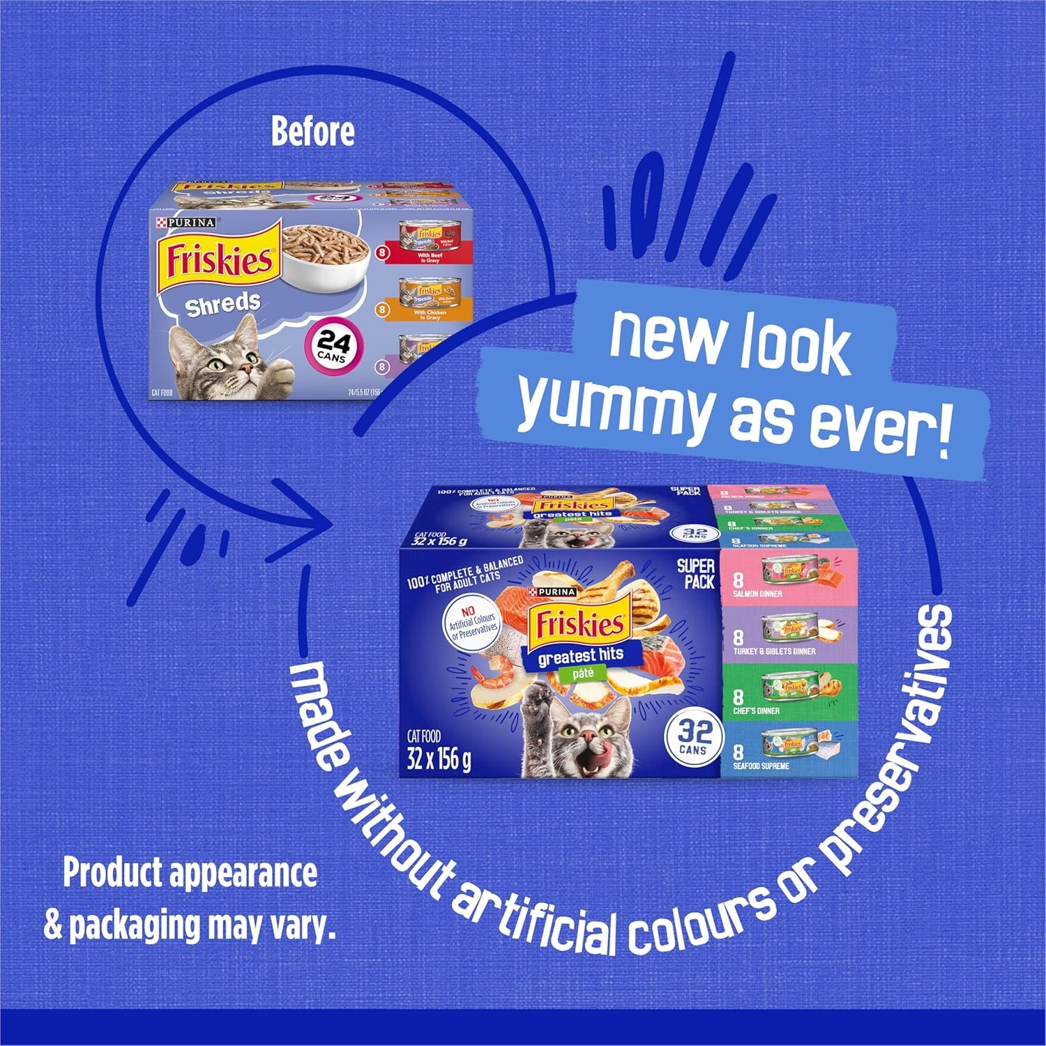 Friskies Greatest Hits Wet Cat Food, Pate Variety Pack 4 Flavours – 156 g Can (32 Pack)