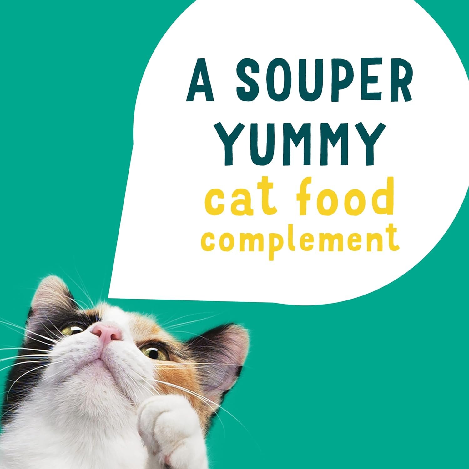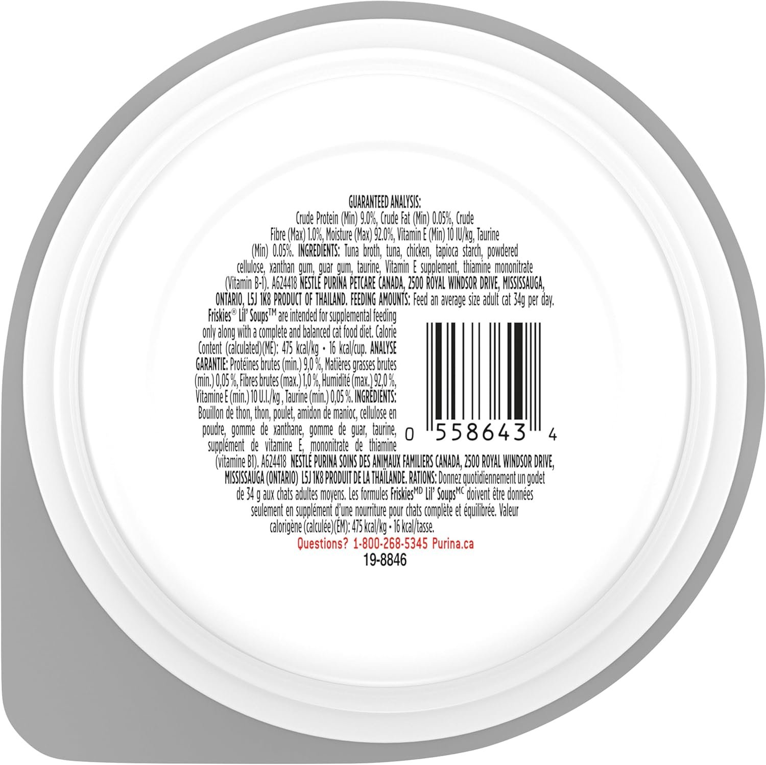 Cat Food Complement with Skipjack Tuna in a Velvety Tuna Broth A cat food complement + vitamin E and taurine. www.purina.ca 1-800-268-5345 Product of Thailand Give your cat a little something extra to purr about when you offer her Friskies Lil’ Soups with Skipjack Tuna in a Velvety Tuna Broth Lickable Cat Complement. With added vitamins including vitamin E and taurine, and tender tuna morsels that are easy for your favorite feline’s mouth to manage, she gets a delightfully delicious compliment to her daily meal and you get to enjoy the warm feeling that comes from spoiling your best friend. Cats will love to lap their way through the velvety broth and sink their teeth into the tender morsels that make this recipe so irresistible.