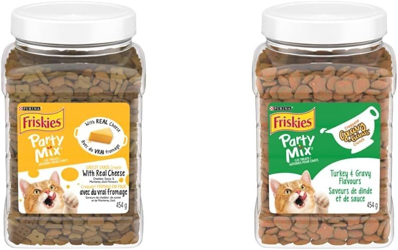 Friskies Party Mix Cat Treats: Cheezy Craze Crunch + Gravy-Licious Turkey & Gravy Crunch