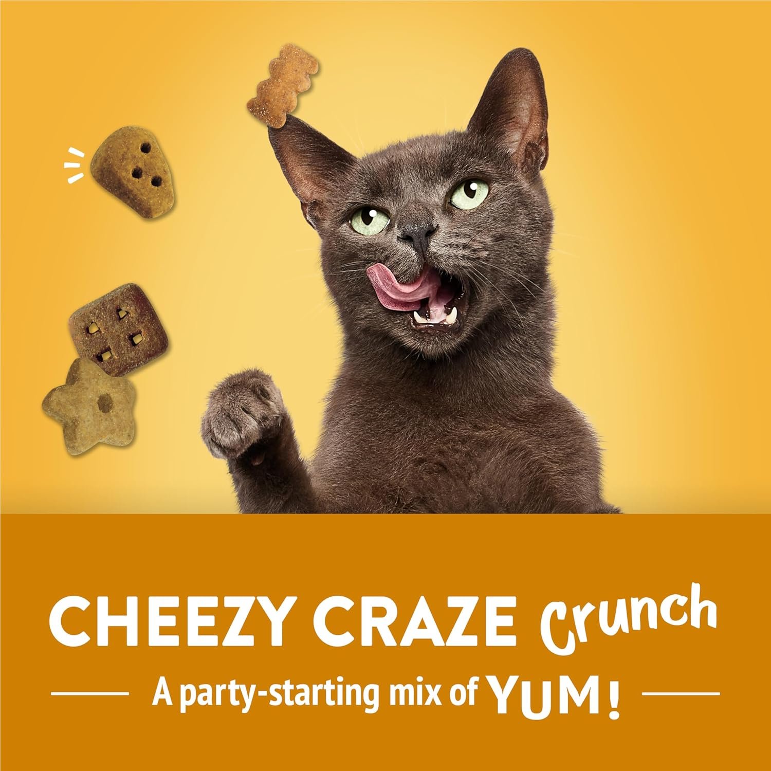 Make your cat’s mouth water with Purina Friskies Party Mix Cheezy Craze Crunch cat treats. Bursting with bold flavour, these cat treats are made with real cheese in every bite-sized piece to tantalize her taste buds. We mix together a cat-licious blend of cheddar, swiss and Monterey Jack cheeses for a cheesy flavour combination so intense it makes cats go nuts. This crunchy cat treat offers a satisfying texture for munchers and nibblers alike while it helps clean teeth. Every canister includes a variety of exciting shapes to rev up your cat’s engine during play time and get the party rockin’. Your cat can sniff out the real thing. Give her the goods with a cat treat so cheesy it drives cats crazy for more. Show your cat just how much you love her with an order of Purina Friskies Party Mix Cheezy Craze Crunch cat treats.
