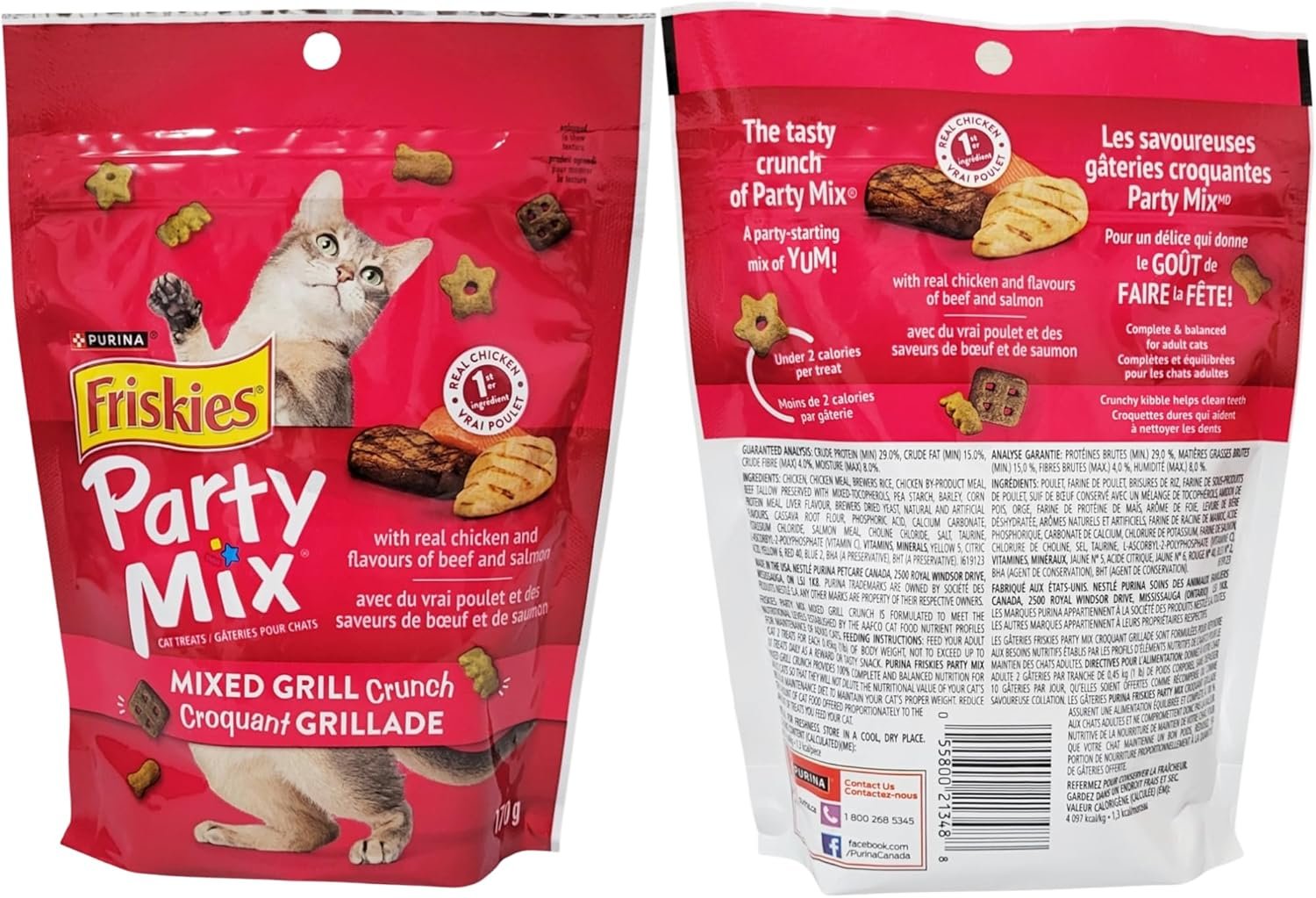 Made with real chicken as the #1 ingredient and flavored with beef & salmon, Friskies Party Mix Mixed Grill Crunch cat treats deliver a crunchy, savory snack cats love with under 2 calories per treat