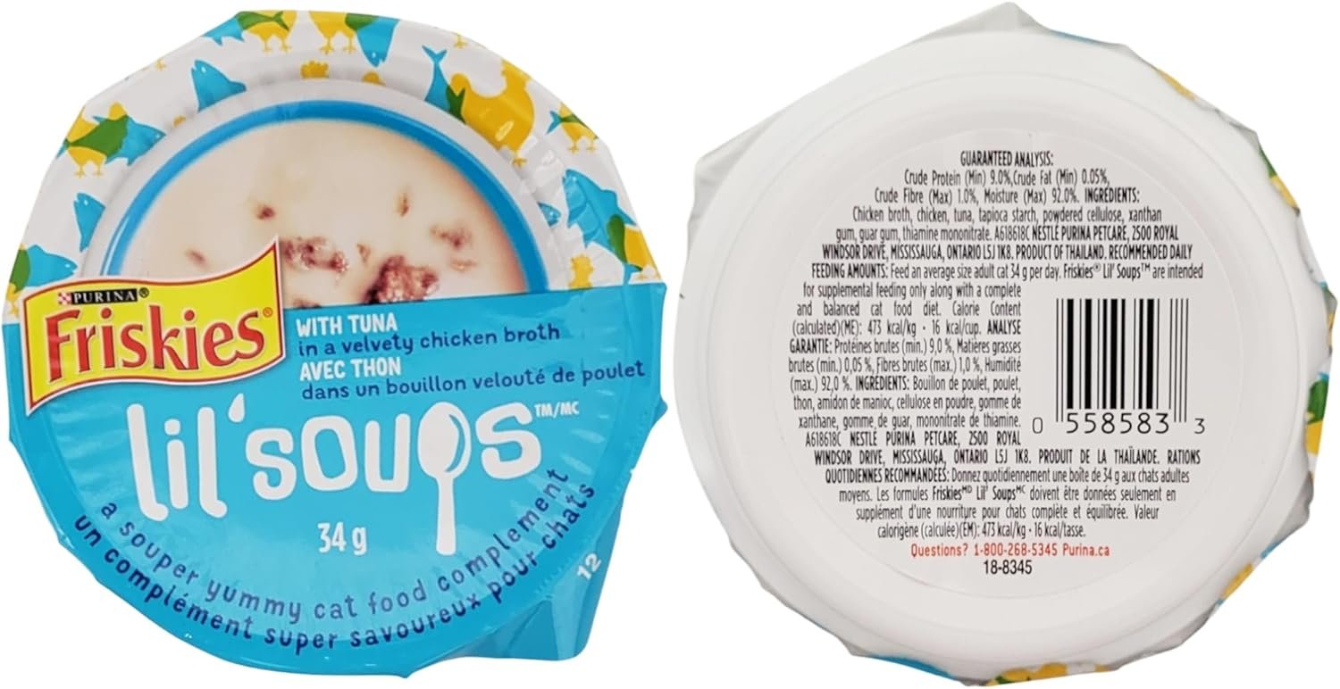 Friskies Lil’ Soups Wet Cat Food complements feature real tuna in a savory, velvety chicken broth, providing a delicious and hydrating addition to your cat’s daily meal plan