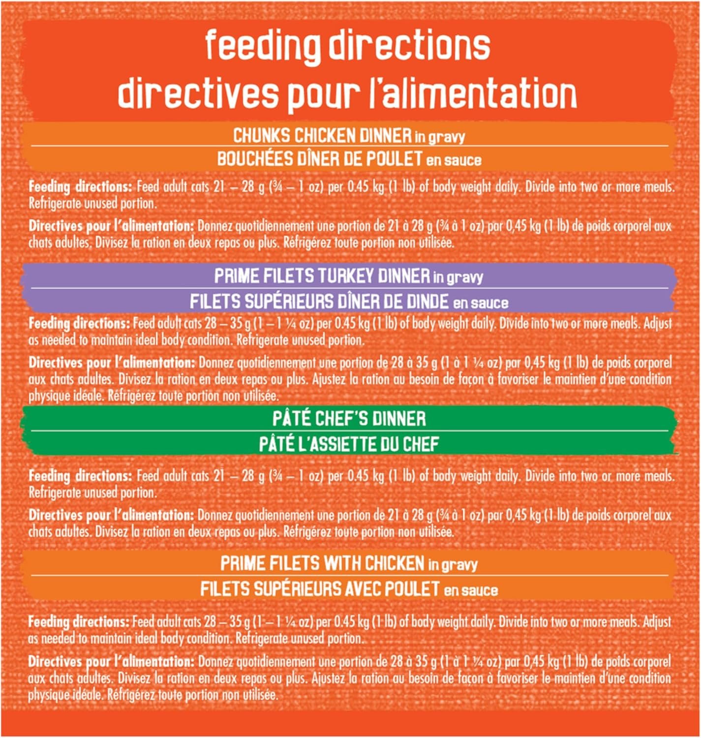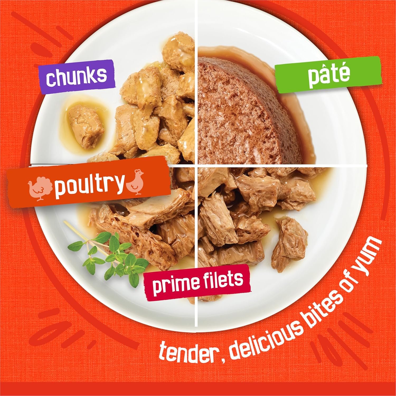 Delictable chicken and turkey recipes in a variety of formats including chunks, prime filets, and pate. Contains 8 x Friskies Chunks Chicken Dinner in Gravy, 8 x Friskies Prime Filets with Chicken in Gravy, 8 x Friskies Prime Filets Turkey Dinner in Gravy, and 8 x Friskies Pate Chef’s Dinner.