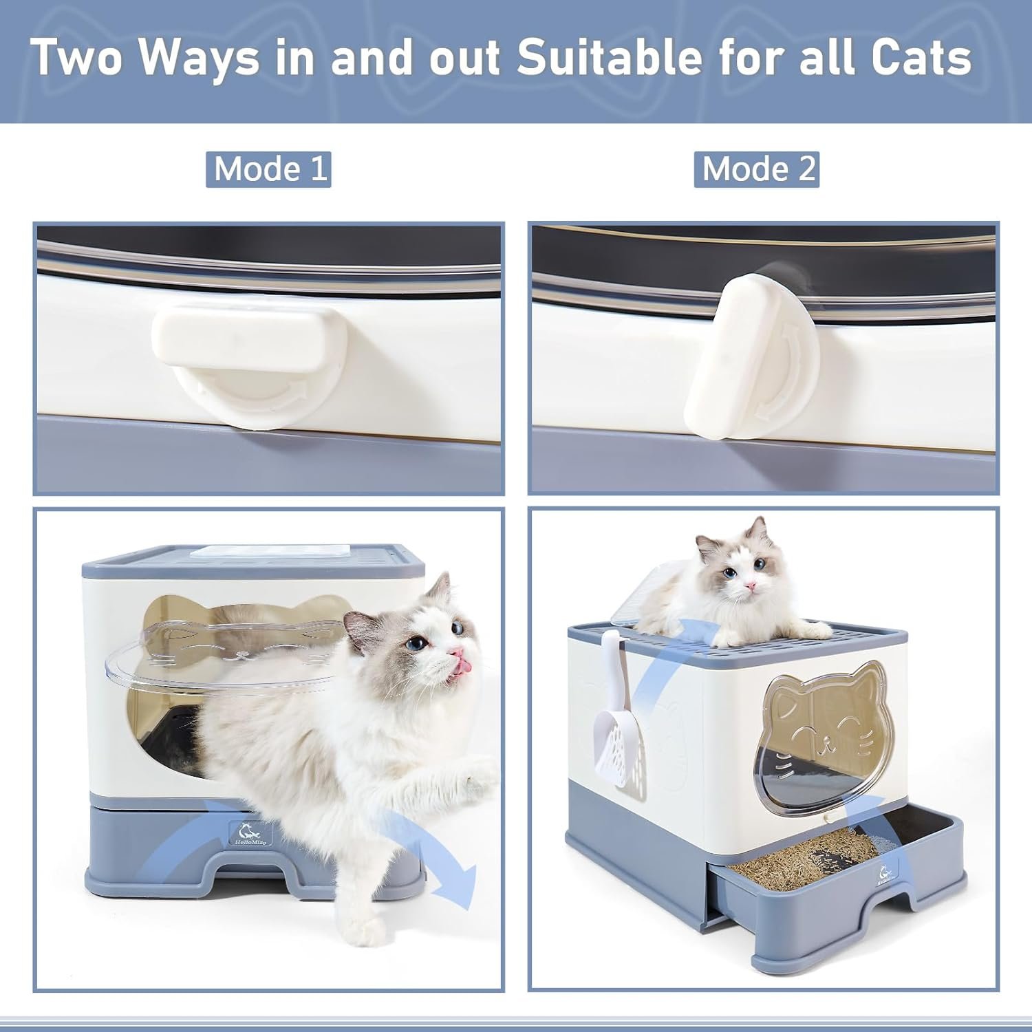 😺【𝐓𝐰𝐨 𝐖𝐚𝐲𝐬 𝐭𝐨 𝐄𝐧𝐭𝐞𝐫 𝐚𝐧𝐝 𝐄𝐱𝐢𝐭】- The fully enclosed litter box can enter and exit through the front door and the top, and can be used by cats of all ages. By adjusting the button on the front door, kittens and old cat can enter and exit through the front door, big cat can enter through the front door and jump out from the top. Fish-scale inclined pedal design reduces While slowing the odor emission, the cat