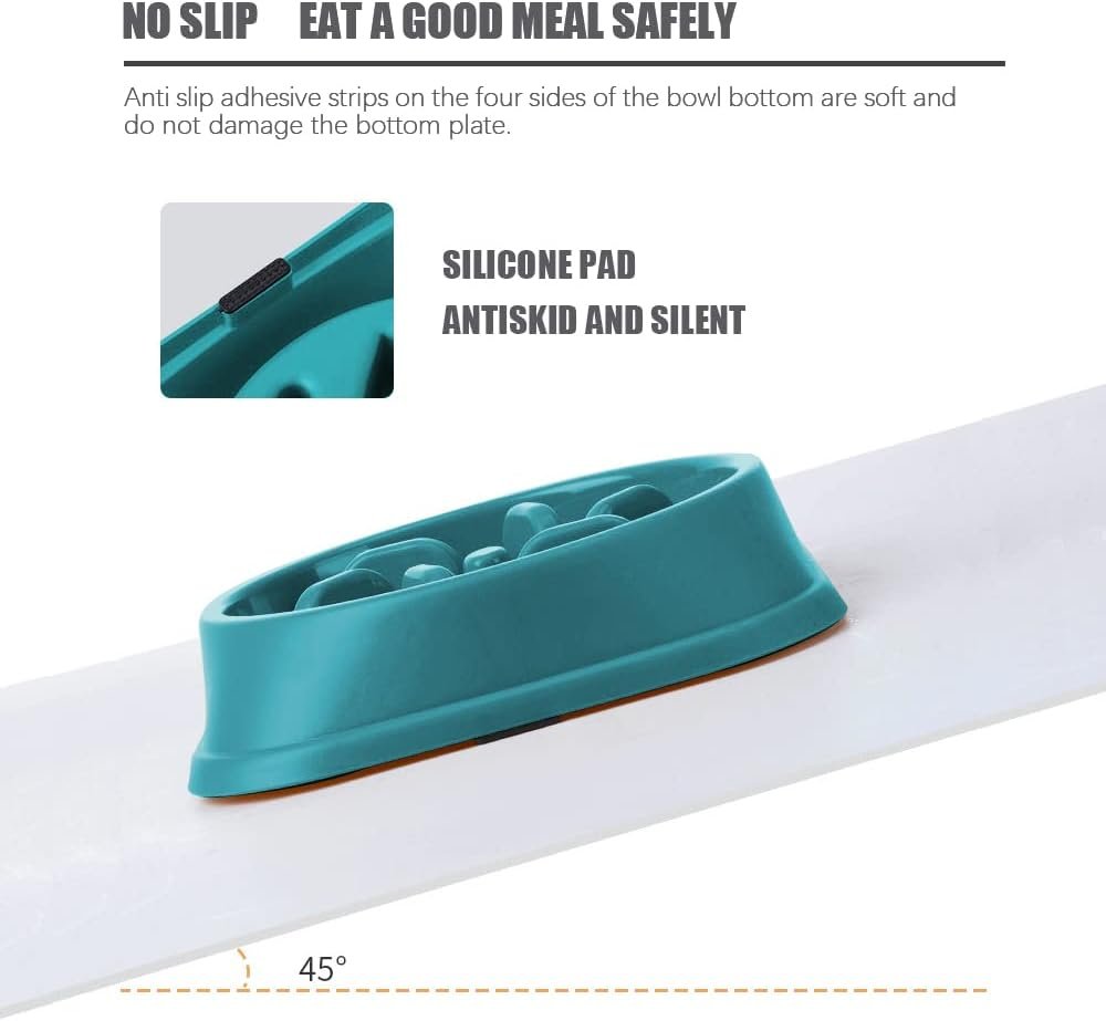 Reduce Slip Design: There are four anti-skid rubber feet in the package that can be glued to the bottom four sides of the slow feeder to prevent the bowl from slipping. The slow flow dog bowl base widened to prevent being knocked over by pets.