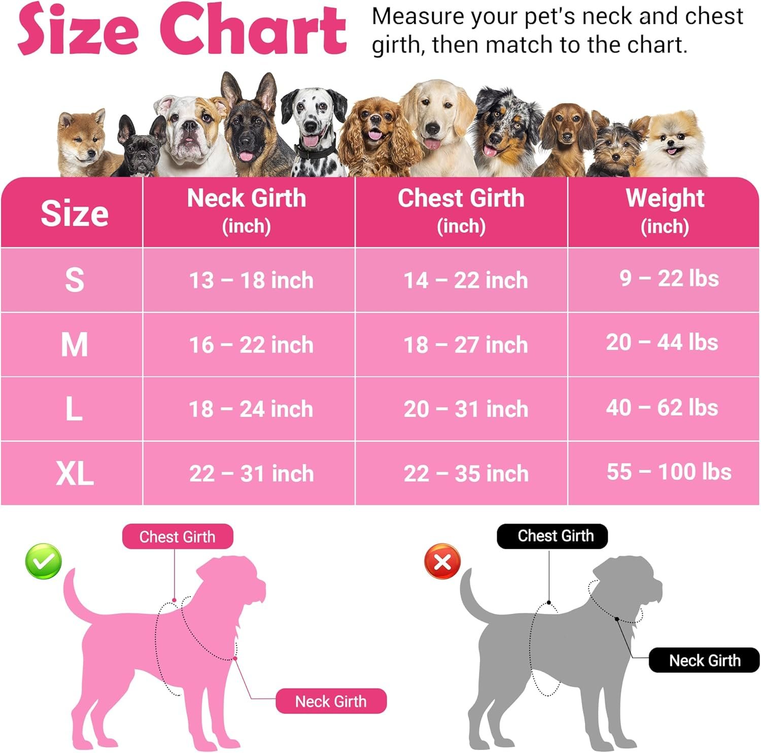 CHOOSE PROPER SIZE: Neck Girth: 12-17″, Chest Girth: 14-22″. Don’t forget to measure the girth of the NECK and CHEST, then refer to the size chart to find out the correct size. It can be adjusted to maximize the comfort of your doggie.
