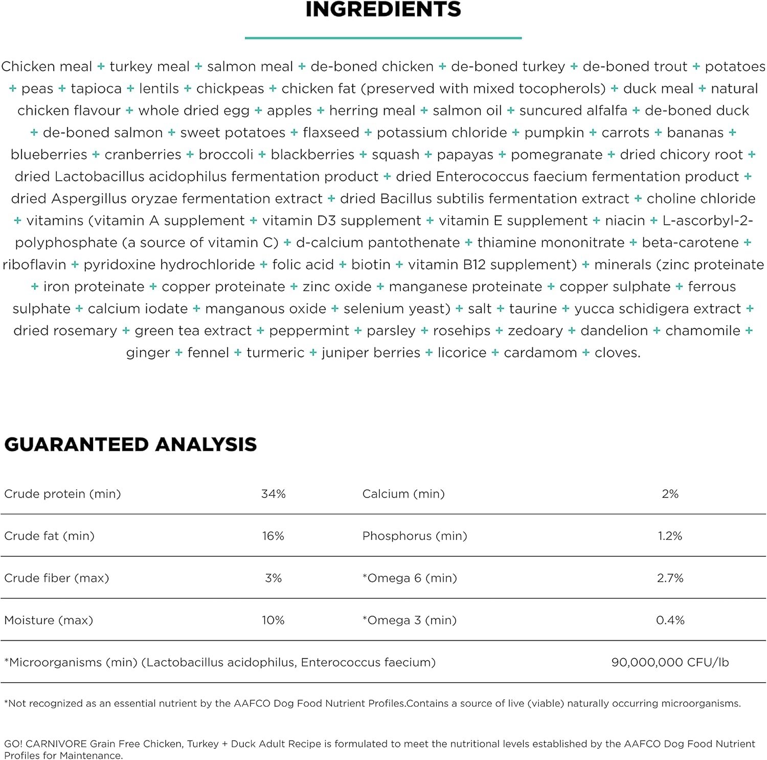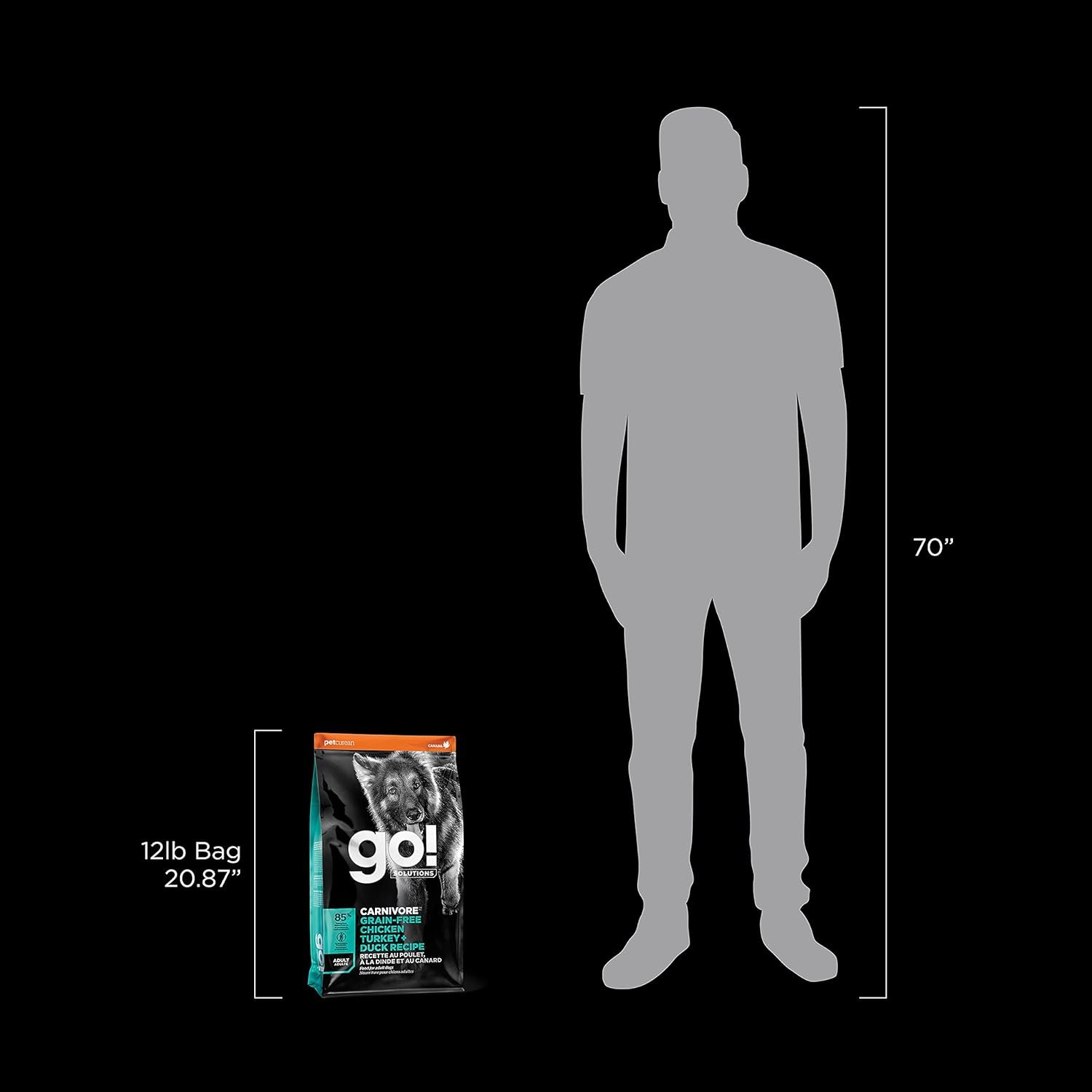Fuel your dog’s playful spirit with our Go! Solutions Carnivore Grain-Free Chicken, Turkey + Duck Adult Recipe. Expertly formulated by a team of qualified and dedicated pet nutritionists, these protein-rich recipes deliver robust nutrition using an assortment of premium-quality animal proteins for a healthful, hearty meal. The first six ingredients—and 85% of the protein—in this recipe come from premium-quality animal sources, with a tasty blend of 11 real animal ingredients including chicken, turkey, salmon, trout, duck, and herring to tempt picky eaters. Enhanced with added digestive enzymes, probiotics, and prebiotic fiber from dried chicory root and pumpkin to support your dog’s gastrointestinal wellness and healthy digestion. Crafted with a medley of fruits and vegetables including cranberries, blueberries, and blackberries, as natural sources of antioxidants to support your dog’s immune health. Suitable for all breed sizes: small breed, medium breed, and large breeds. Our recipes feature premium-quality real meat, poultry, and fish and contain no artificial preservatives, flavors, colors, by-product meals, corn, wheat, or soy. Made in Canada.