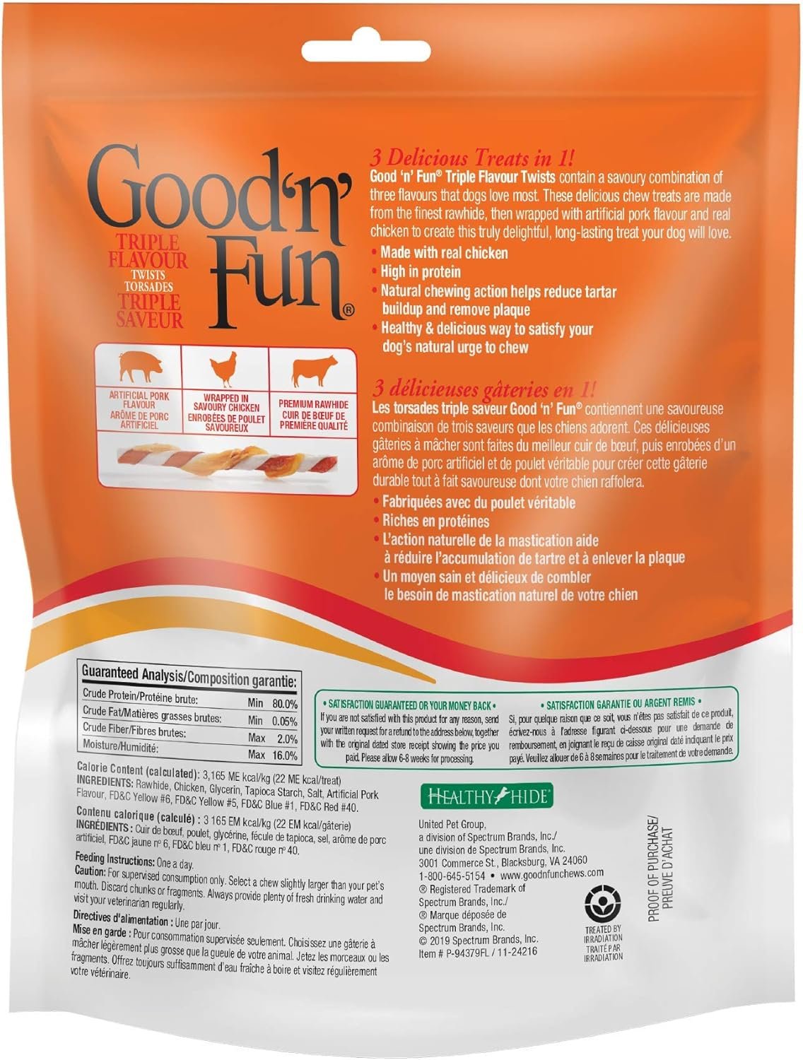 Tails will be wagging for these flavour-packed Good’n’Fun Triple Flavour Twists. These twist-shaped dog treats are made with a savoury combination of three flavours that dogs love most. These delicious chew treats are made from the finest pork and beef hides, then wrapped with real chicken to create a truly delightful, long-lasting rawhide treat your dog will love. High in protein, Good’n’Fun Triple Flavour Ribs are a healthy and delicious way to satisfy your dog’s natural urge to chew. The natural action of chewing also helps reduce tartar buildup and remove plaque. These gourmet twist shaped chews make for long-lasting entertainment.