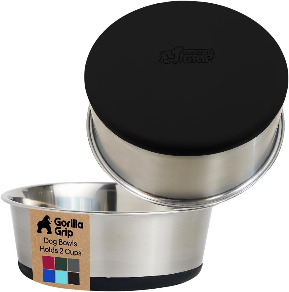 GORILLA GRIP Stainless Steel Metal Dog Bowl Set of 2, Rubber Base, Heavy Duty, Rust Resistant, Food Grade BPA Free, Less Sliding, Quiet Pet Bowls for Cats and Dogs, Holds 2 Cups (16 fl oz), Black