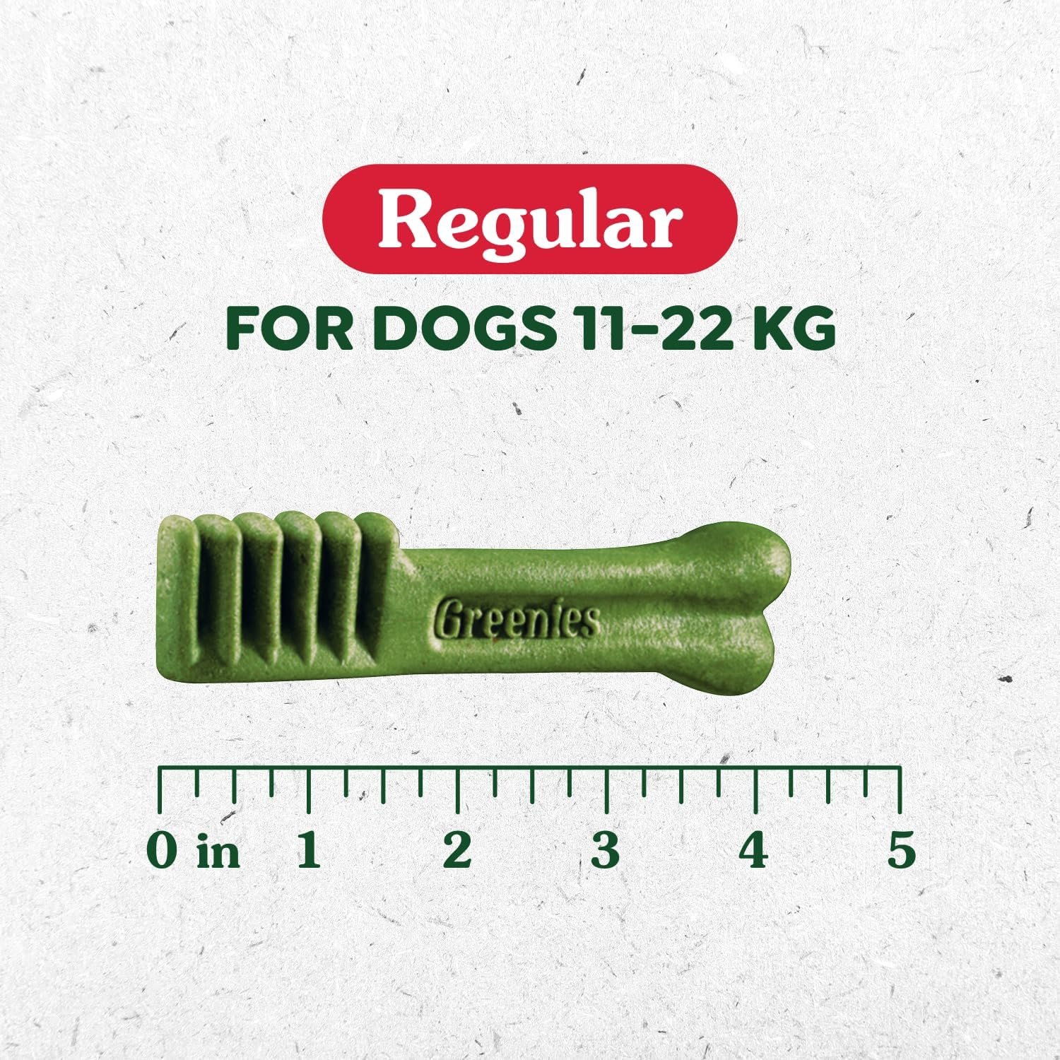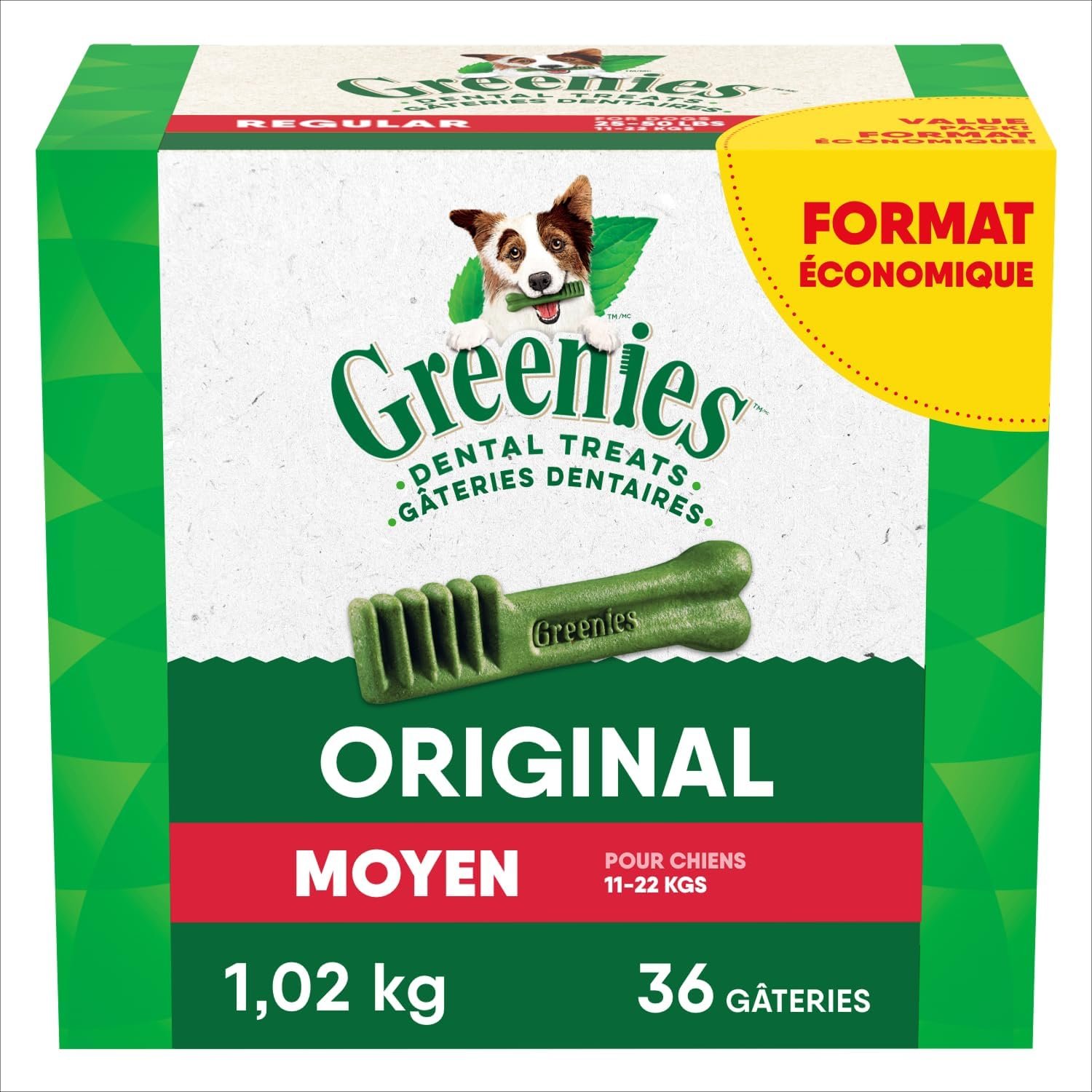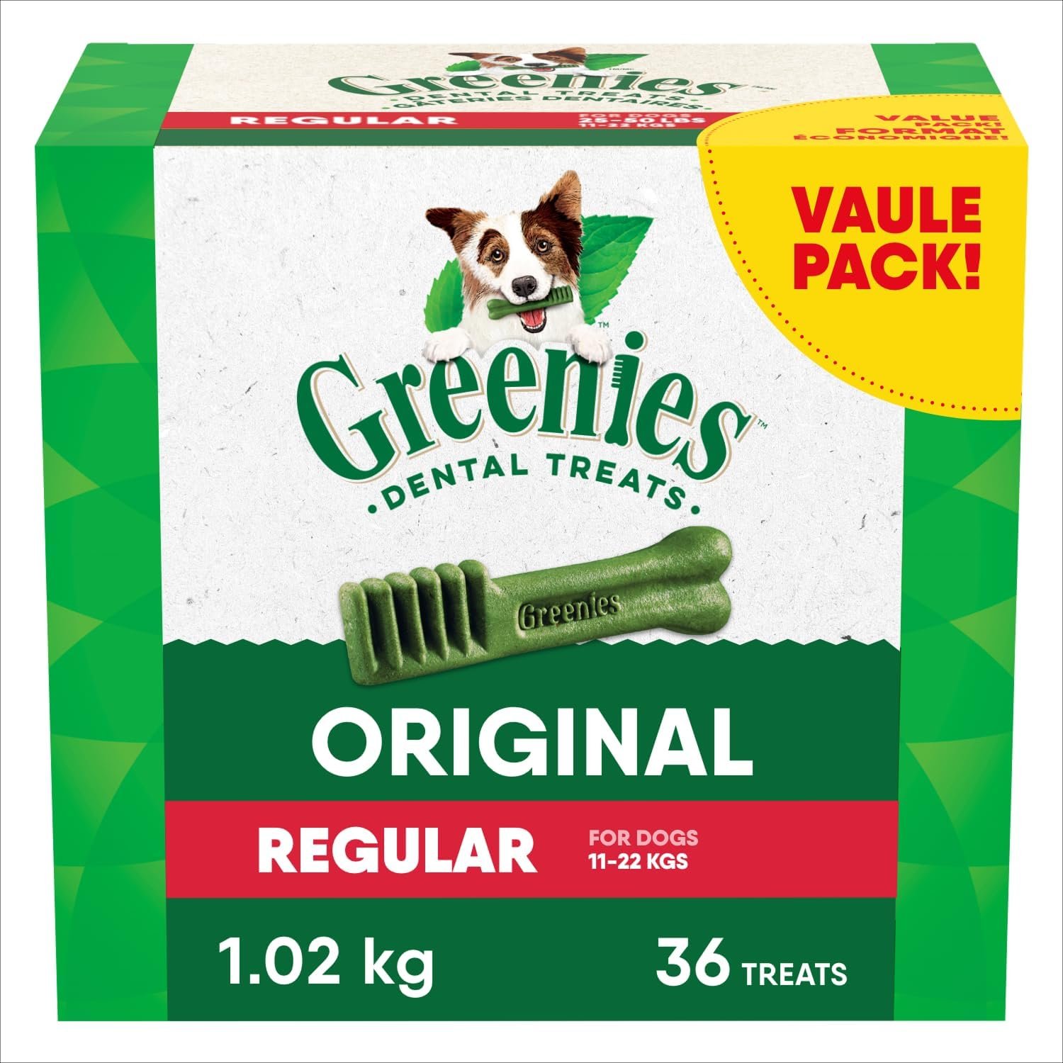 Contains: One (1) 1.02kg box, 36-count of GREENIES Original Adult Dog Dental Treats, Regular size for dogs 11-22kg