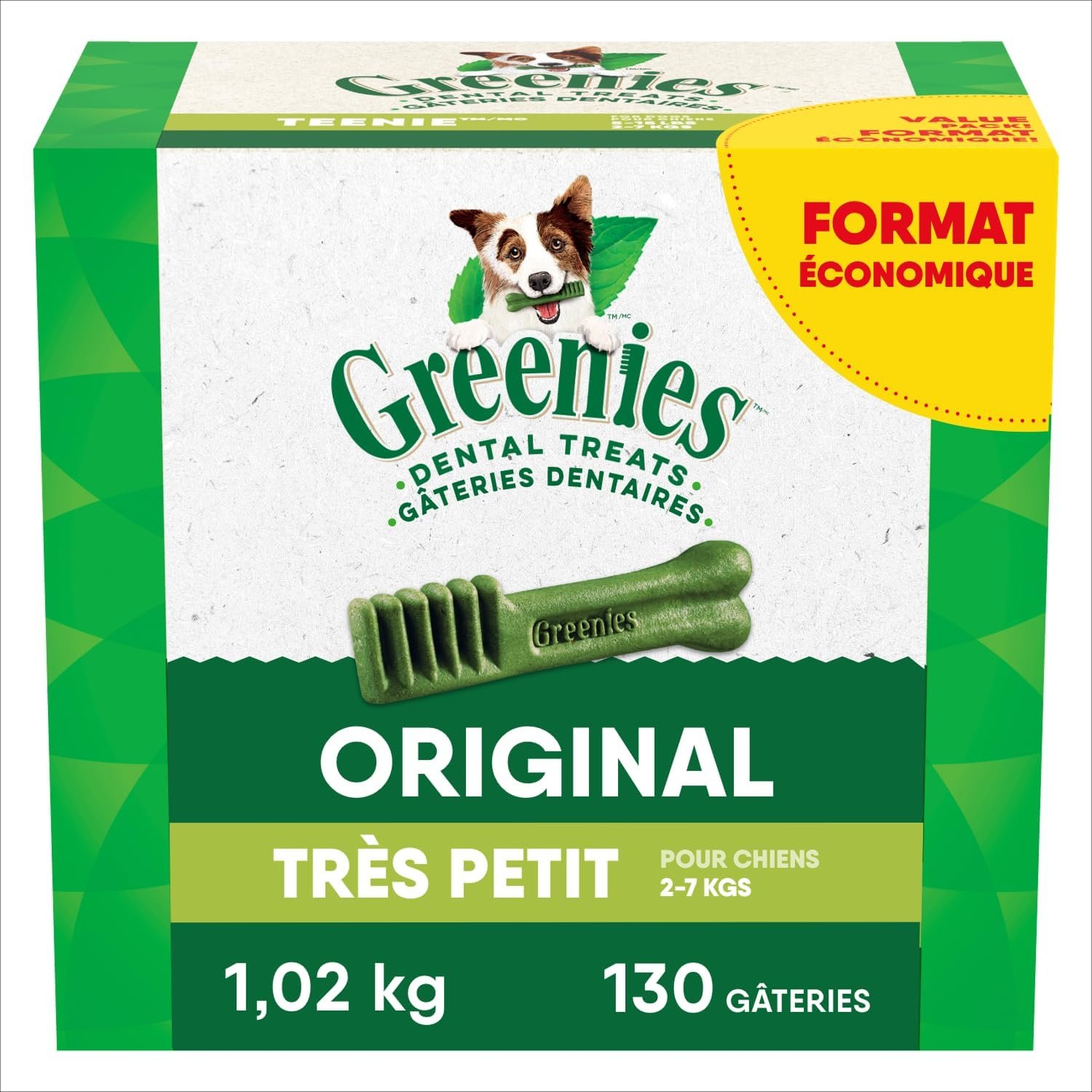 CONTAINS: One (1) 1.02g, 130-count box GREENIES TEENIE Original Dog Dental Treats, For small dogs 2-7kg