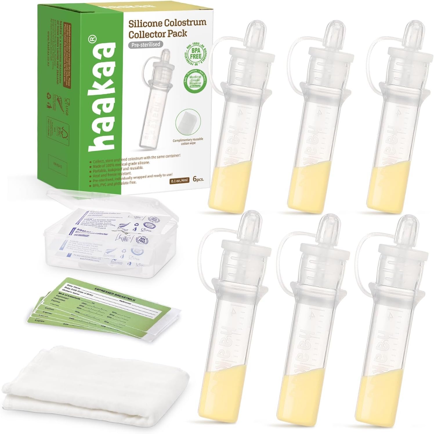 haakaa Colostrum Collector with Storage Case Set, Included 1 pc Reusable Cotton Wipe and Storage Box (0.1oz/4ml, 6 pcs)