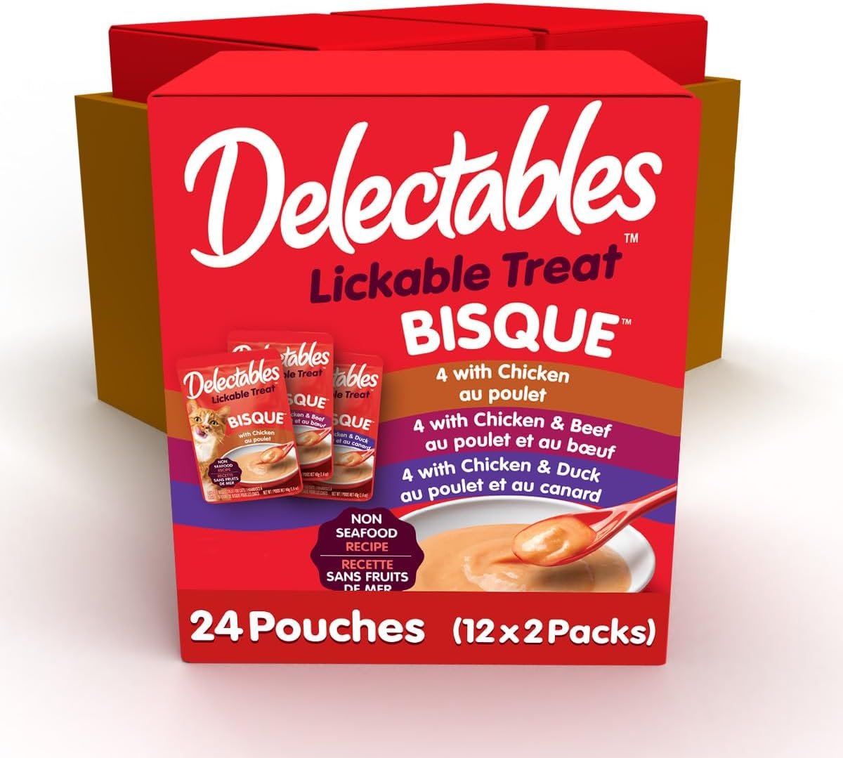 CONTAINS: 24 x 1.4oz Delectables Bisque Non-Seafood Lickable Cat Treat pouches