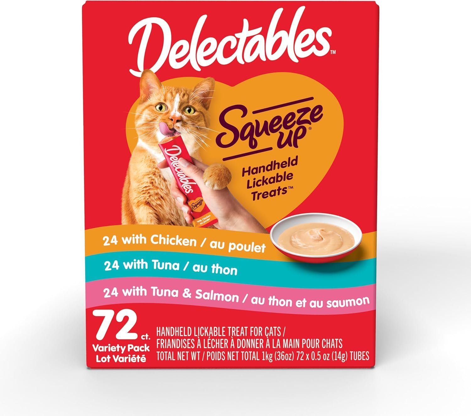 Elevate treat time with Delectables Squeeze Up Lickable Cat Treats Variety Pack! These convenient handheld tubes deliver an irresistible, creamy purée crafted with high-quality cage-free chicken, delectable wild-caught tuna, and savory wild-caught salmon. Use as an interactive bonding treat, hydrating snack, or food topper for picky eaters. These 100% grain-free cat treats are made without fillers or preservatives, offering a premium cat indulgence your feline will love.