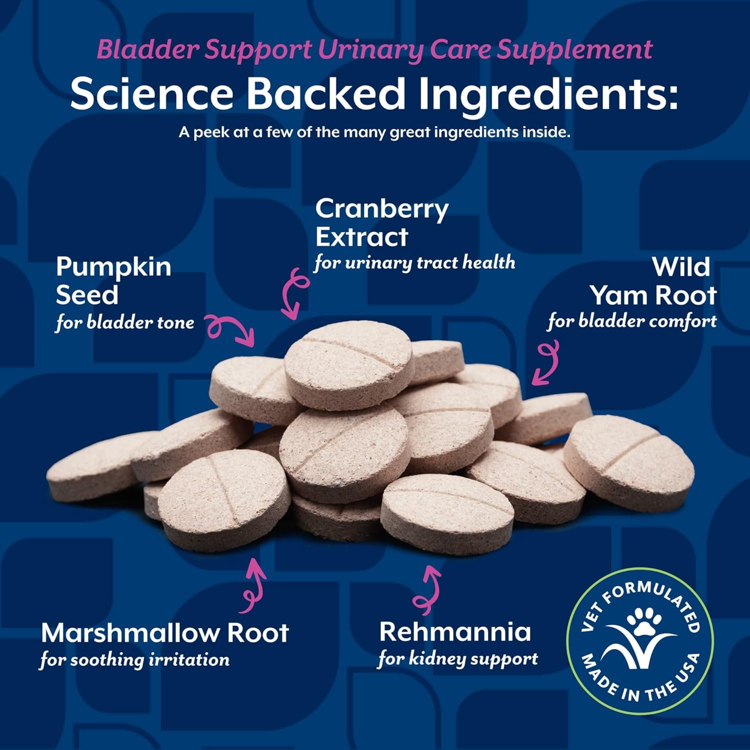 Veterinarian formulated with Pumpkin Seed, Calcium Ascorbate (Vitamin C) and Cranberry Extract.
