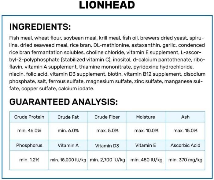 A food developed specifically to promote prominent head growth while enhancing the coloration of goldfish kept indoors where adequate UV rays may not be available to help them develop natural coloration. Great for Oranda, Lionhead, Azumanishiki, Ranchu and most other fancy goldfish who feed from the surface readily.