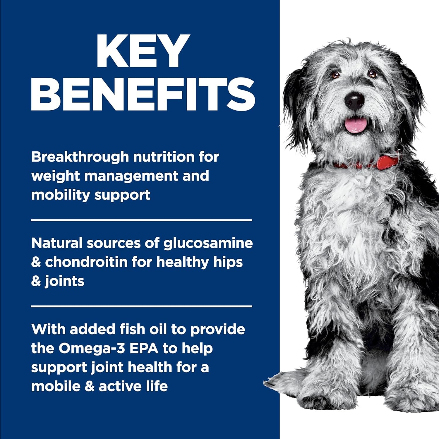 This weight management and mobility support dog food was created with Hill’s unique understanding of the biology of overweight dogs. It provides lean muscle support, and also uses clinically proven antioxidants for a healthy immune system. With added fish oil to provide EPA, an Omega-3, to help support joint health for a mobile & active life. Feed this breakthrough nutrition for your dog’s healthy weight maintenance, long-lasting weight support and joint health.