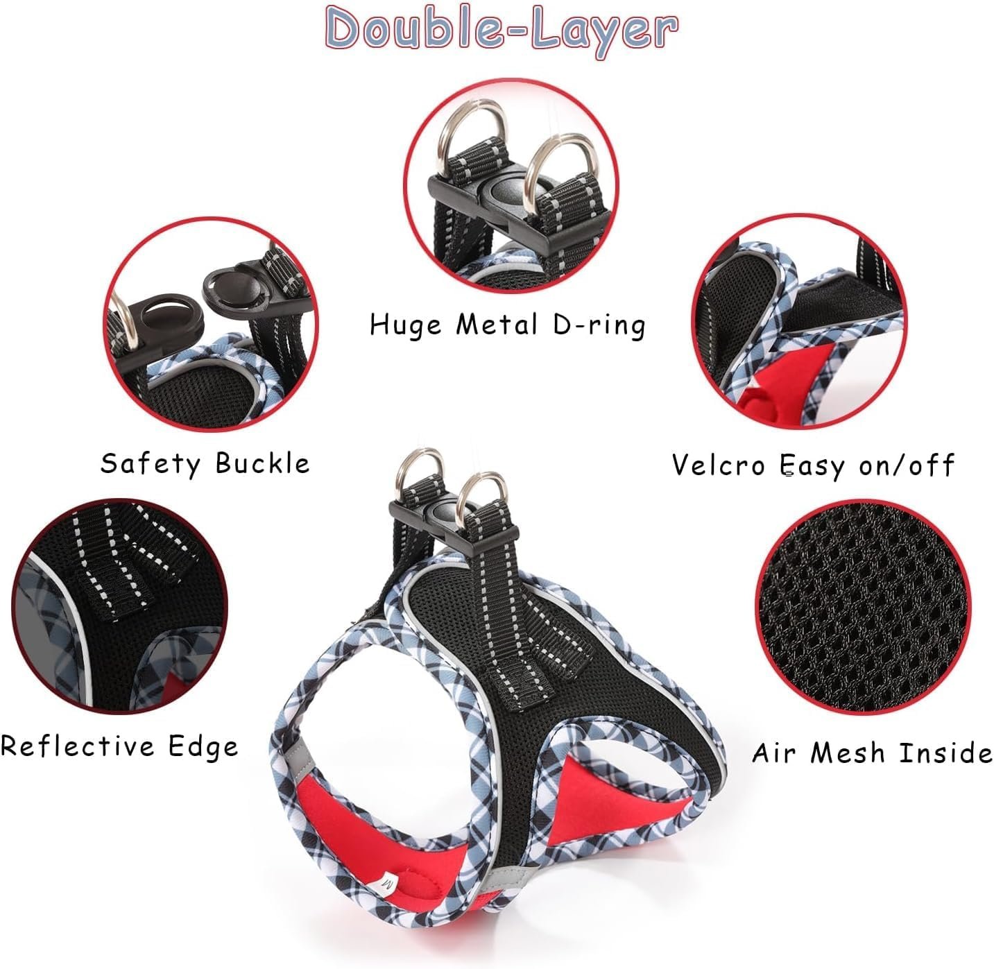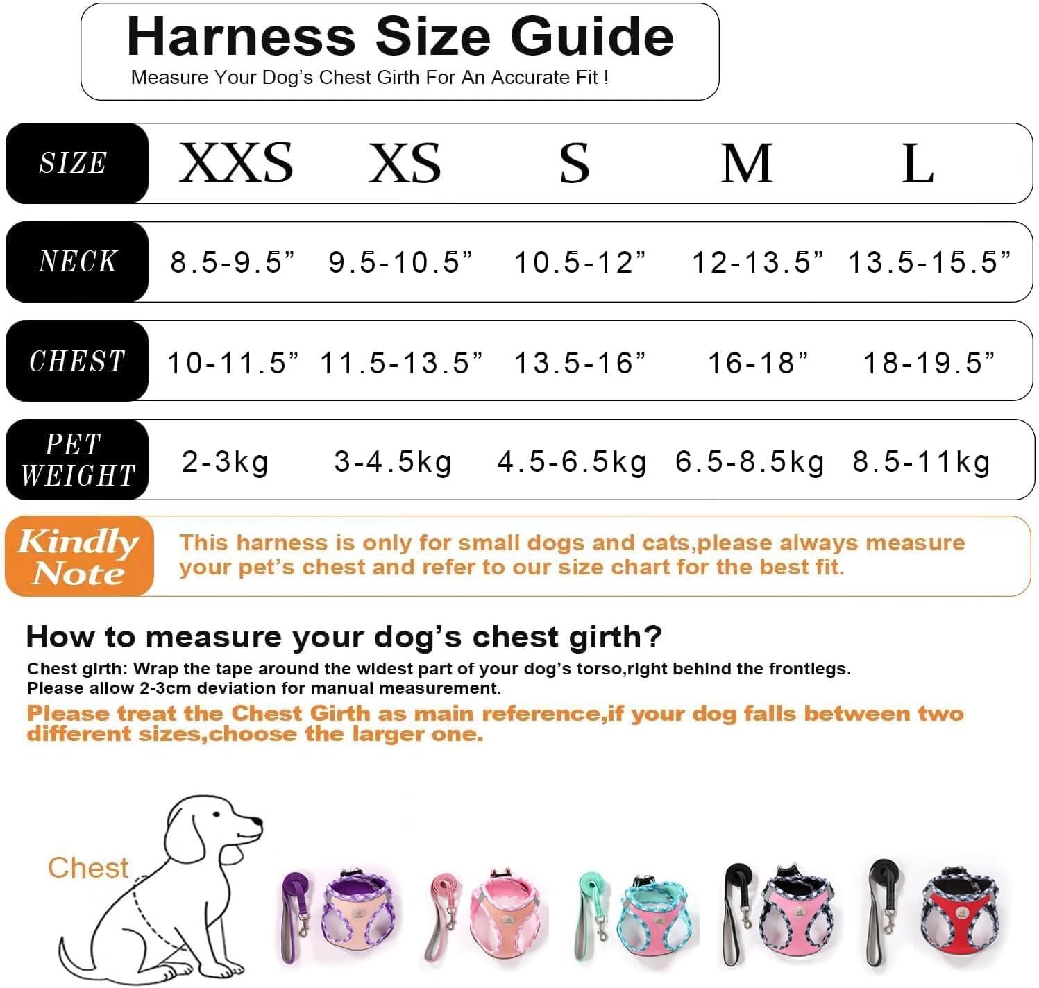 【Breathable Air Mesh】 The dog harness is made with soft mesh fabric,which is high-density, soft and comfortable, and can prevent chewing or tearing.The dog harness suitable for extra-small/small medium large dogs and cats
