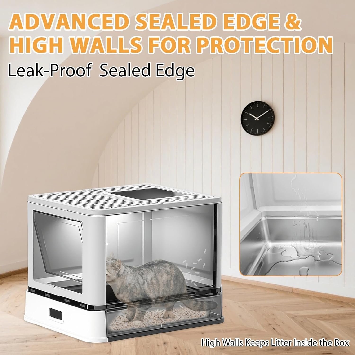 Leak-Proof Enclosed Design: Our 16.5″ high enclosed litter box features advanced leak-proof construction with seamless sidewalls and upgraded edge sealing. Litter box with high sides contain litter scatter while the tight-seal design prevents urine leakage. The enclosed litter box furniture includes a convenient scoop holder and textured interior to minimize sticking. The snug-fitting enclosure ensures odor control