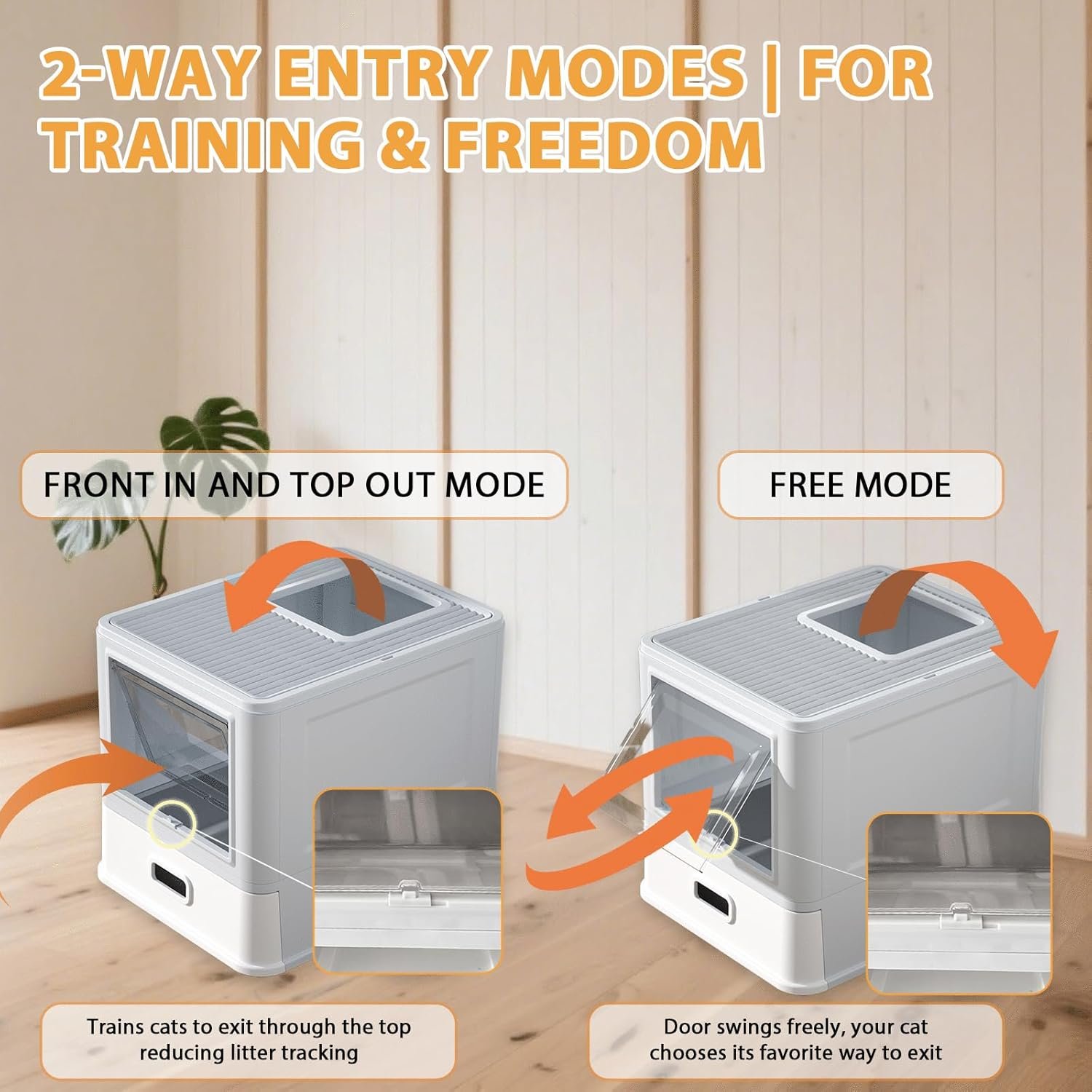 Front-Entry & Top-Exit Design – This stainless steel litter box (19″L × 15″W × 16.5″H) features a top-exit structure, cats enter through the 10.6″ × 7.9″ clear flap and exit from the top. The cat litter box top features 5mm hollow sand falling pedal, which automatically shakes off excess litter as cats jump out, minimizing tracked-out mess