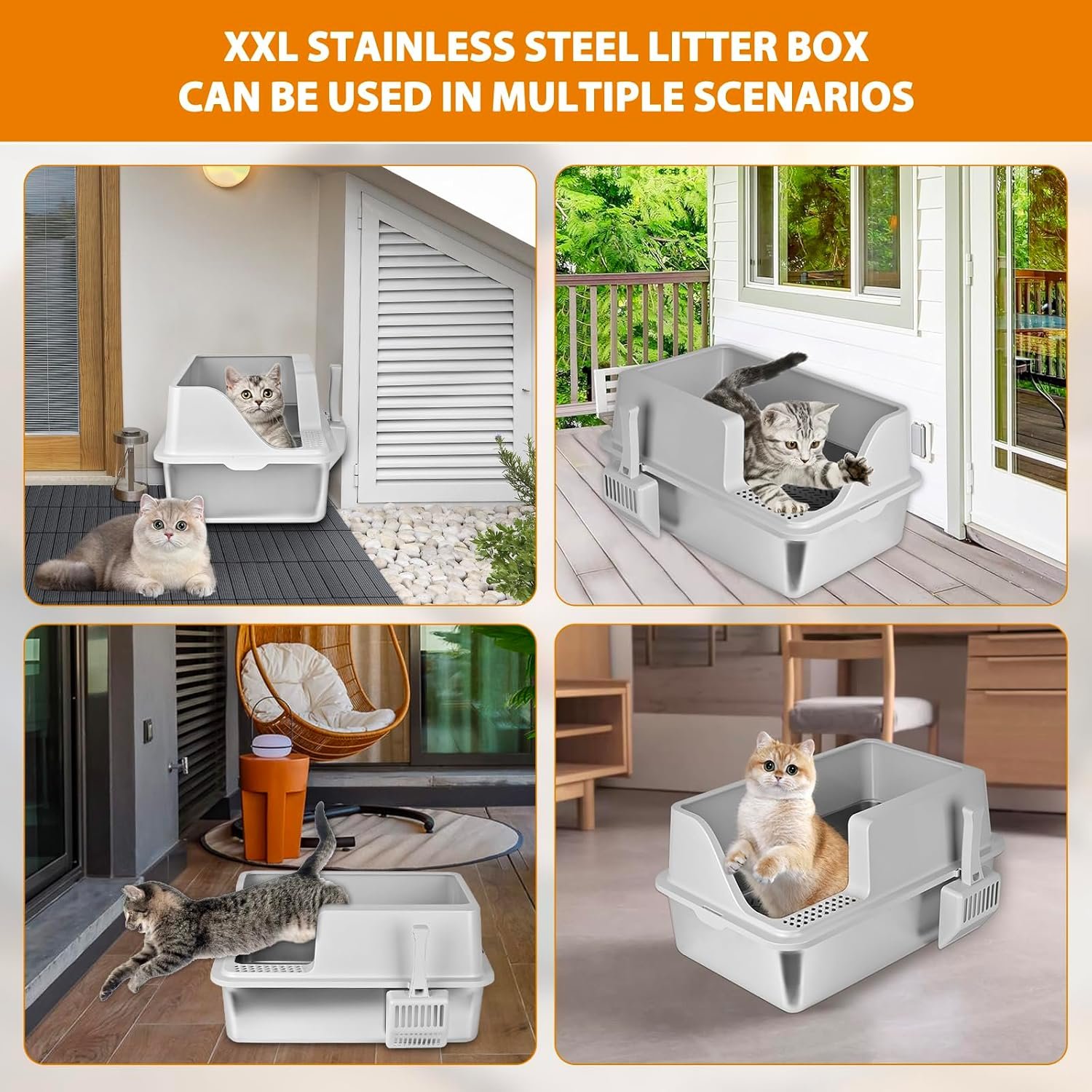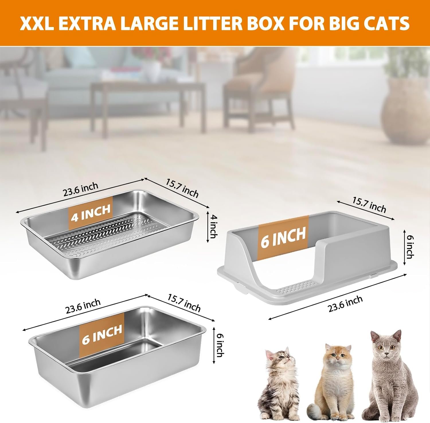 Upgraded XL & XXL Stainless Steel Litter Box with Lid: Choose from two spacious sizes: XL litter box: Bottom pan (23.6″L x 15.7″W x 6″H), sifting tray (23.6″L x 15.7″W x 4″H), and 6″ lid.XXL stainless steel litter box: Larger bottom pan (23.6″L x 15.7″W x 8″H), deeper sifting tray (23.6″L x 15.7″W x 6″H), and 6″ lid.Ideal for big cats and multi-cat households, this extra large cat litter box ensures comfort