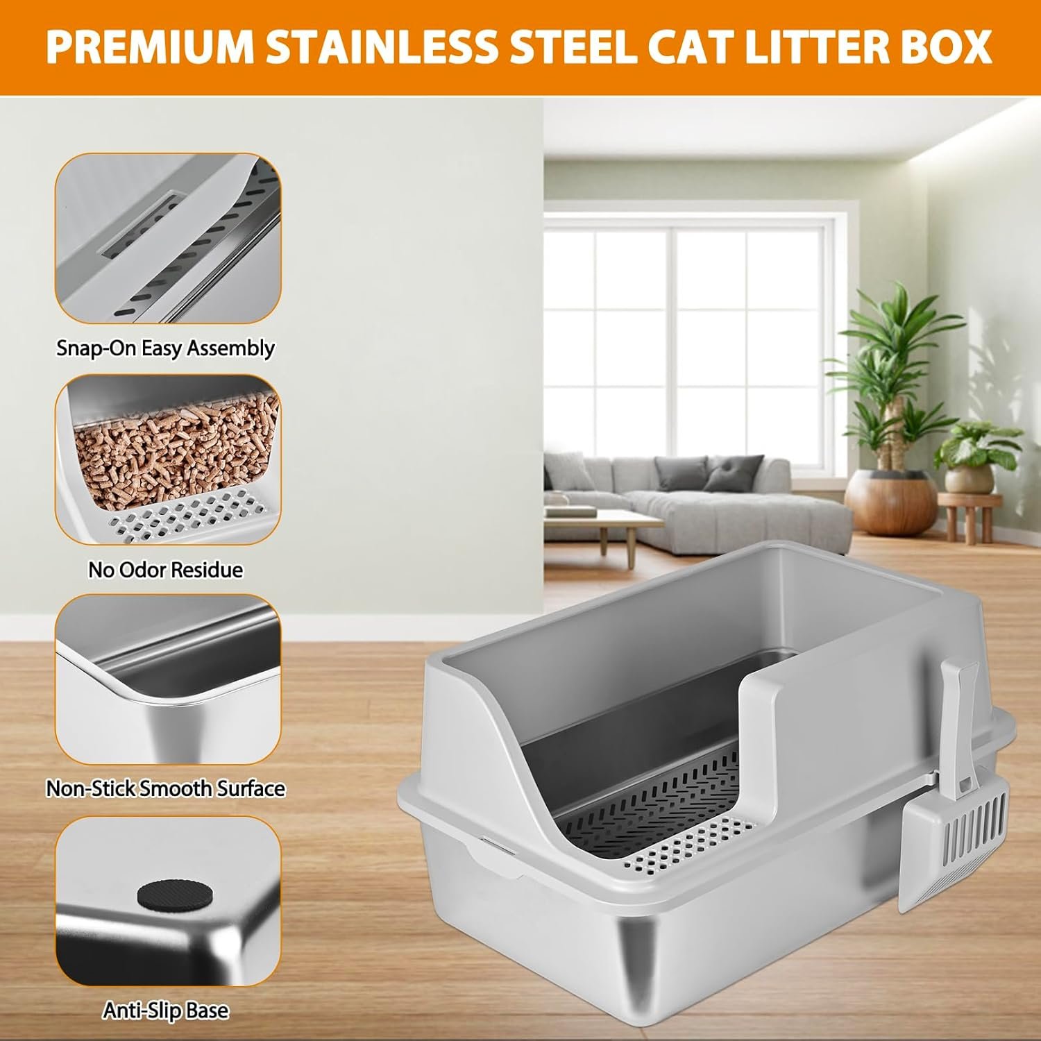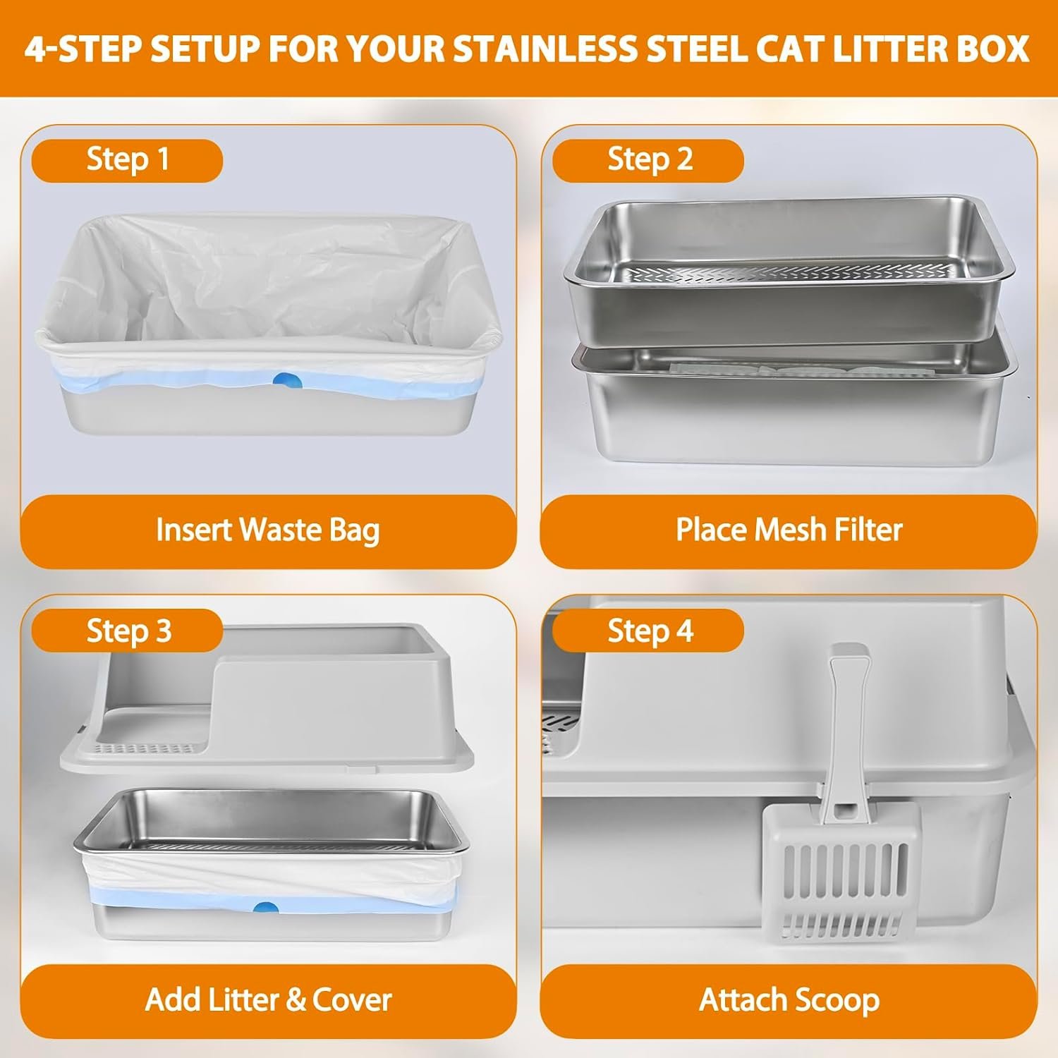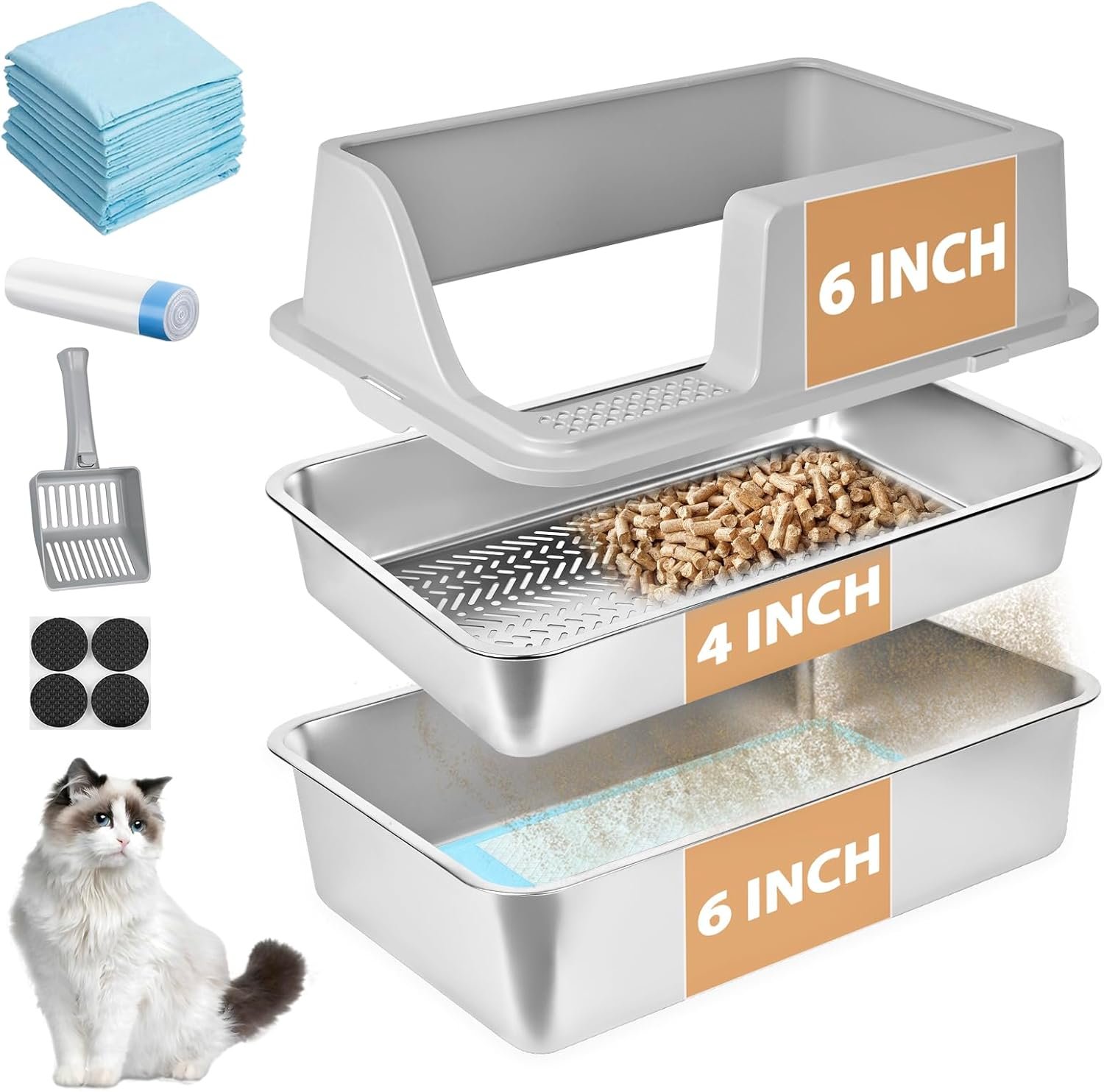 Includes Essential Accessories: This stainless steel sifting cat litter box for indoor cats comes with: 1 roll of litter box bags,10 pee pads,1 plastic cat litter scoop,4 non-slip pads and 1 user manual, make litter box stainless steel maintenance effortless with these handy extras