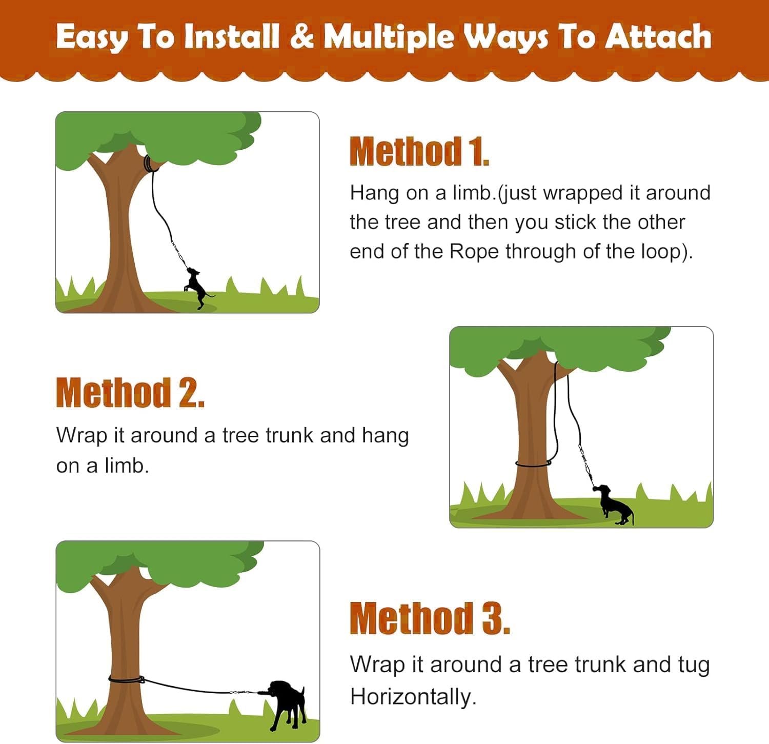 【SOLO PLAY】Life gets busy. we don’t have time and energy to accompany our dog to play games together. The tether dog tug toy attracts the dog’s chase in the shaking and swing. Pulling and tugging make them endlessly busy, which can relieve dogs’ boredom. Dogs can play it all day by themselves. It’s perfect for your dogs to play tug-of-war games and it does not tear your arms up. The dog tree tug toy is like the flirt pole. Fun for them, and fun for you to watch!