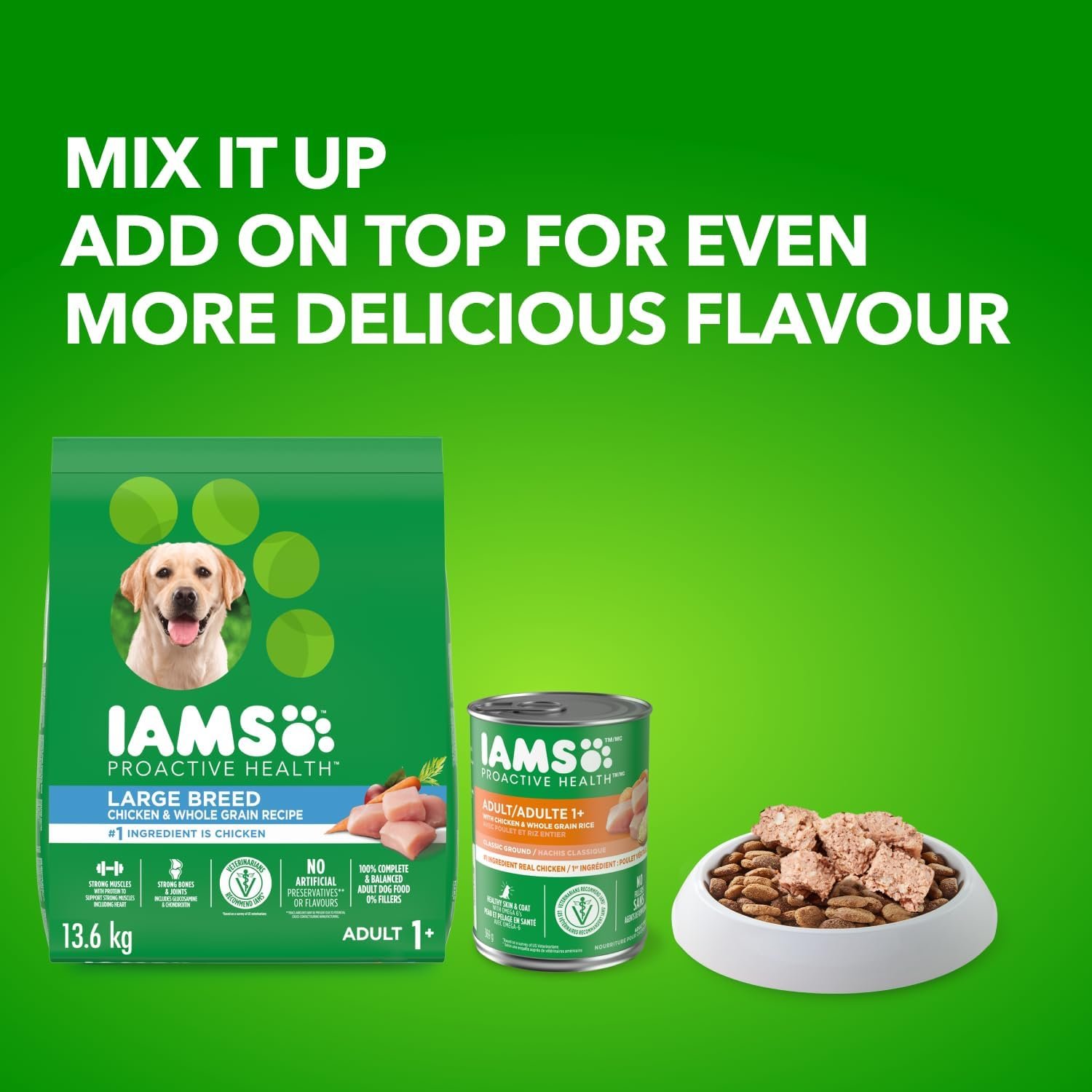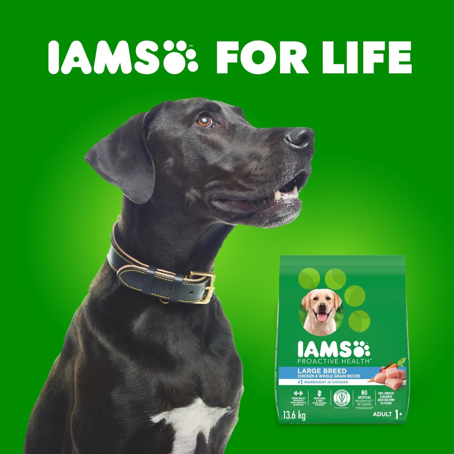 Feed your dog the food they deserve with IAMS Proactive Health dry dog food. Specially formulated to support large-breed adult dogs, the IAMS Chicken & Whole Grain recipe contains farm-raised chicken, wholesome grains, and tasty vegetables for complete and balanced nutrition. Created with glucosamine and chondroitin to support strong bones and joints in bigger dogs and a tailored blend of natural fibre for healthy digestion. IAMS Proactive Health contains zero fillers, artificial flavours, or preservatives. At IAMS we understand that not all dogs are the same, so why feed them the same generic food? IAMS understands that every dog is different, and we respect those differences. That’s why IAMS provides a wide range of premium recipes tailored to meet the unique needs of all dogs so that they can be at their best today and every day. Feel good about the food you choose and see the IAMS difference in your dog.