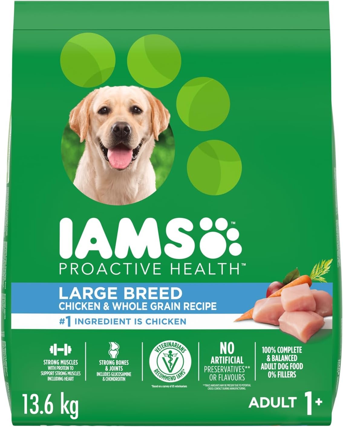IAMS Proactive Health Adult Large Breed Dry Dog Food – Chicken & Whole Grain Recipe – 13.61KG (30LB) Bag
