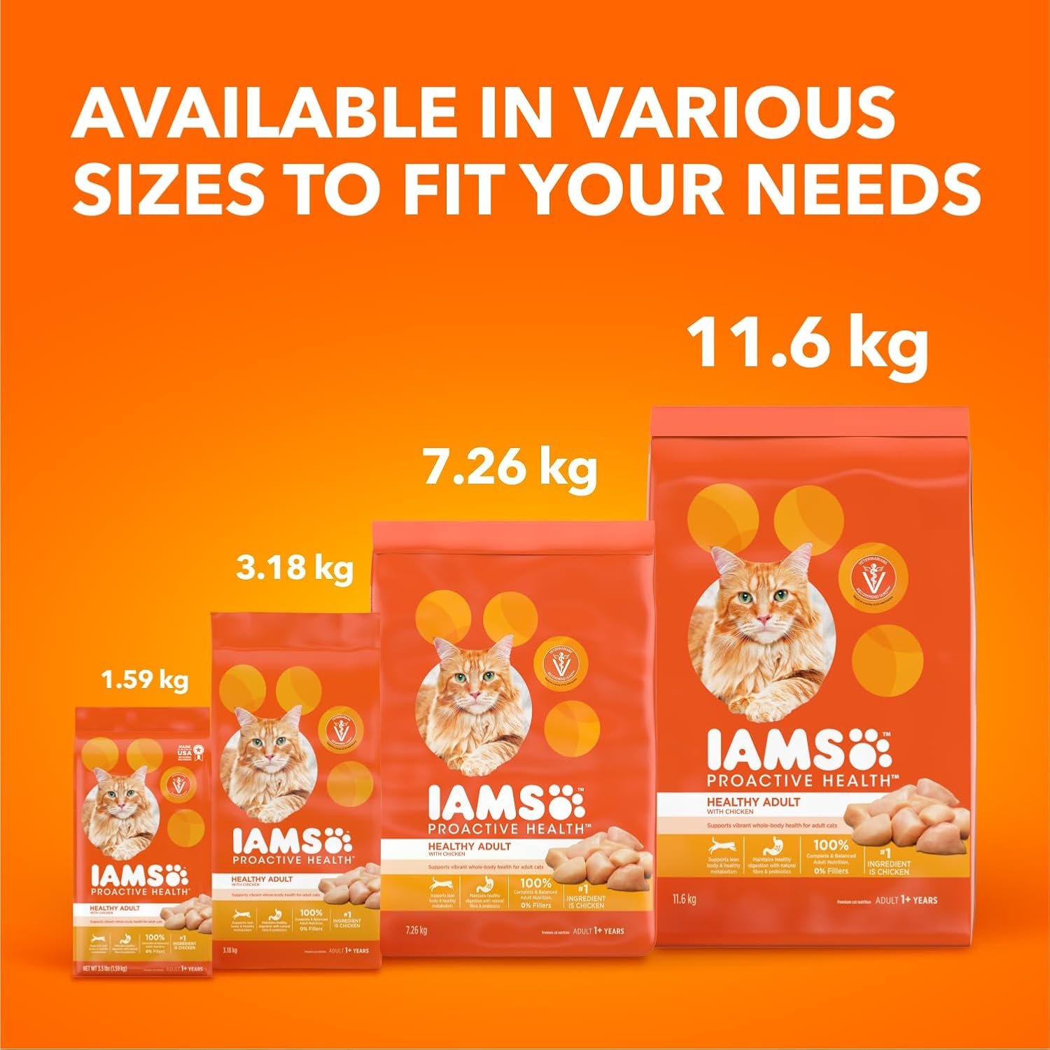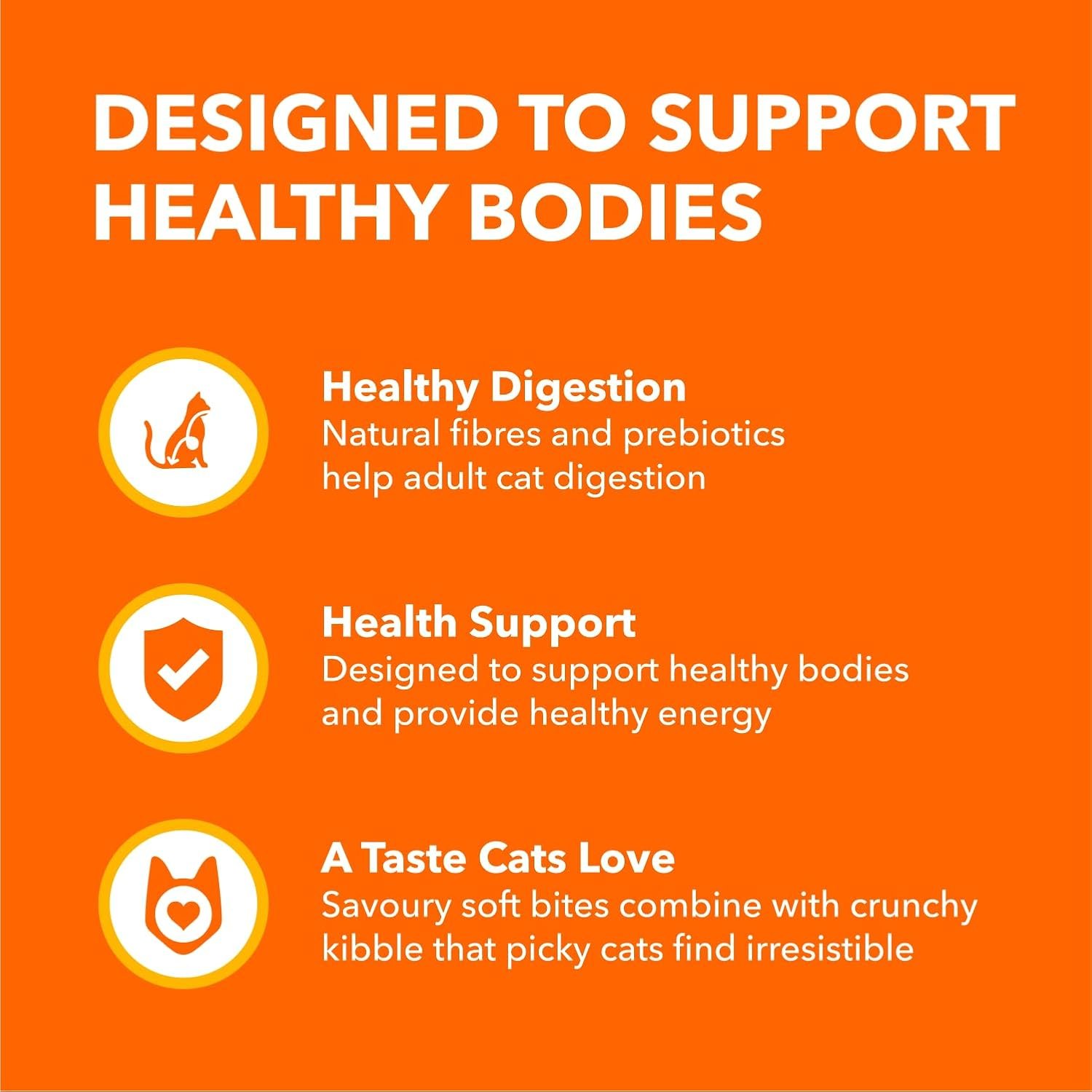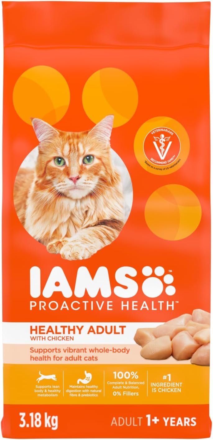 Keep your adult cat healthy and happy with IAMS PROACTIVE HEALTH Healthy Adult dry food, a chicken-first recipe that supports healthy bodies and provides consistent energy. With a tailored fibre blend, prebiotics and beet pulp to support your cat’s natural ability to absorb nutrients and aid the digestive process. This kibble is 100% complete and balanced with zero fillers, meaning you can feel good about the food you choose and see the IAMS difference in your cat. IAMS is dedicated to helping cats live long and healthy lives. Through years of observing cat behaviour, combined with research and dietary findings, IAMS cat food delivers benefits in great-tasting recipes your feline friend will adore. Feel good about the food you choose and see the IAMS difference in your cat.