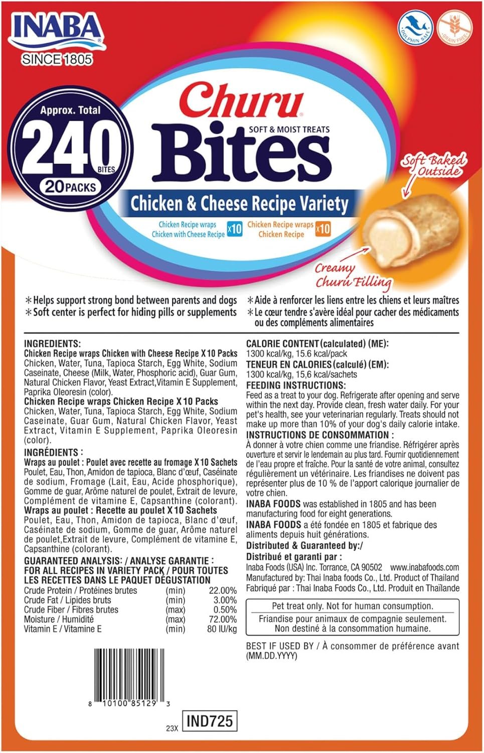 INABA Churu Bites for Dogs, Soft & Chewy Dog Treats with Vitamin E, 11.9 Grams Each Tube, 20 Tubes, Chicken & Cheese Variety Box