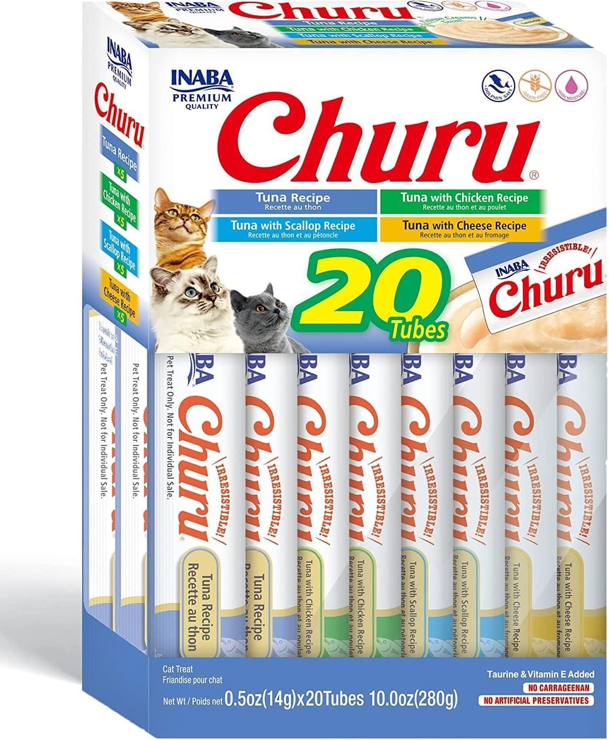 INABA Churu Cat Treats, Grain-Free, Lickable, Squeezable Creamy Purée Cat Treat/Topper with Vitamin E & Taurine, 0.5 Ounces Each Tube, 20 Tubes, Tuna Variety Box