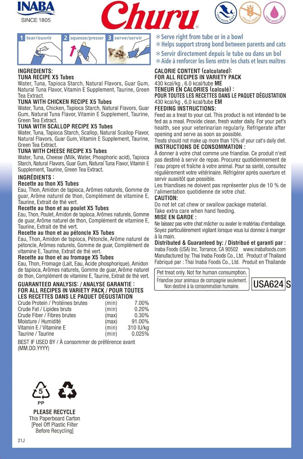 Here at Inaba, we know that your cat is a beloved member of your family. That’s why each of our Churu Lickable Creamy Purée Natural Cat Treats are made from high-quality ingredients, including wild-caught tuna and farm-raised chicken. Since cats are not naturally drawn to water, we have made these a high-moisture, low calorie cat treat that your kitties will love. They contain 91% moisture and have only 6 calories per tube. That’s a tenth of the calories of traditional dry cat treats and more than 1000 times the moisture (8% vs. 91% moisture). In addition, we’ve also added Taurine to help with their vision, digestions and heart health, as well as, Vitamin E for immunity and Green Tea Extract for its natural antioxidants. What they’re missing? They’re grain-free, preservative-free, carrageenan-free and free from artificial colors, making them a cat treat you can feel good about feeding. Designed to be hand fed, you can use to help calm the feistiest of outdoor ferals or treat your pampered indoor pussycat. They can be used a dry/canned cat food topper or to assist with giving medications. Available in 19 savory flavors, you’ll be able to find a flavor that your kitty will crave no matter what stage of life they are (kitten to senior). Inaba Churu makes snack time fun for you and your feline friends.