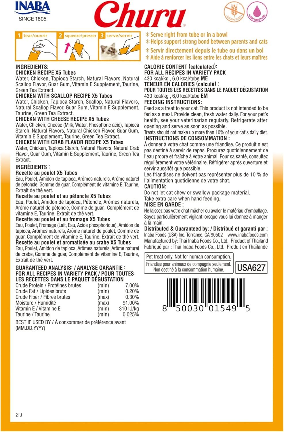 Keeps your cat hydrated without adding calories – each creamy Churu tube contains 91% moisture and only 6 calories (a tenth of the calories of traditional dry cat treats).