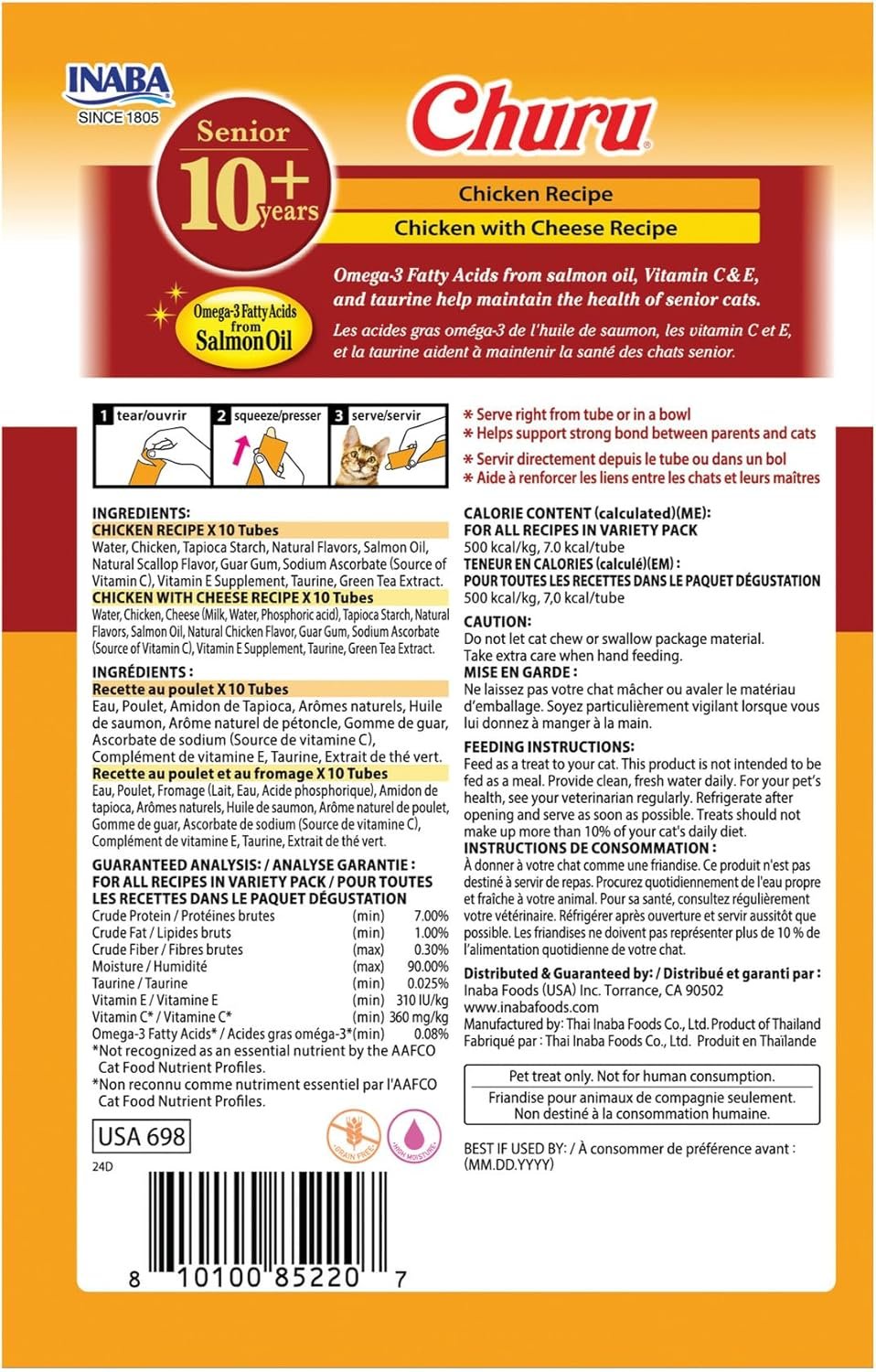 INABA Churu for Senior 10+, Creamy Lickable Cat Treats with Taurine, Vitamin E & C, 14 Grams Each, 20 Tubes, Chicken Variety