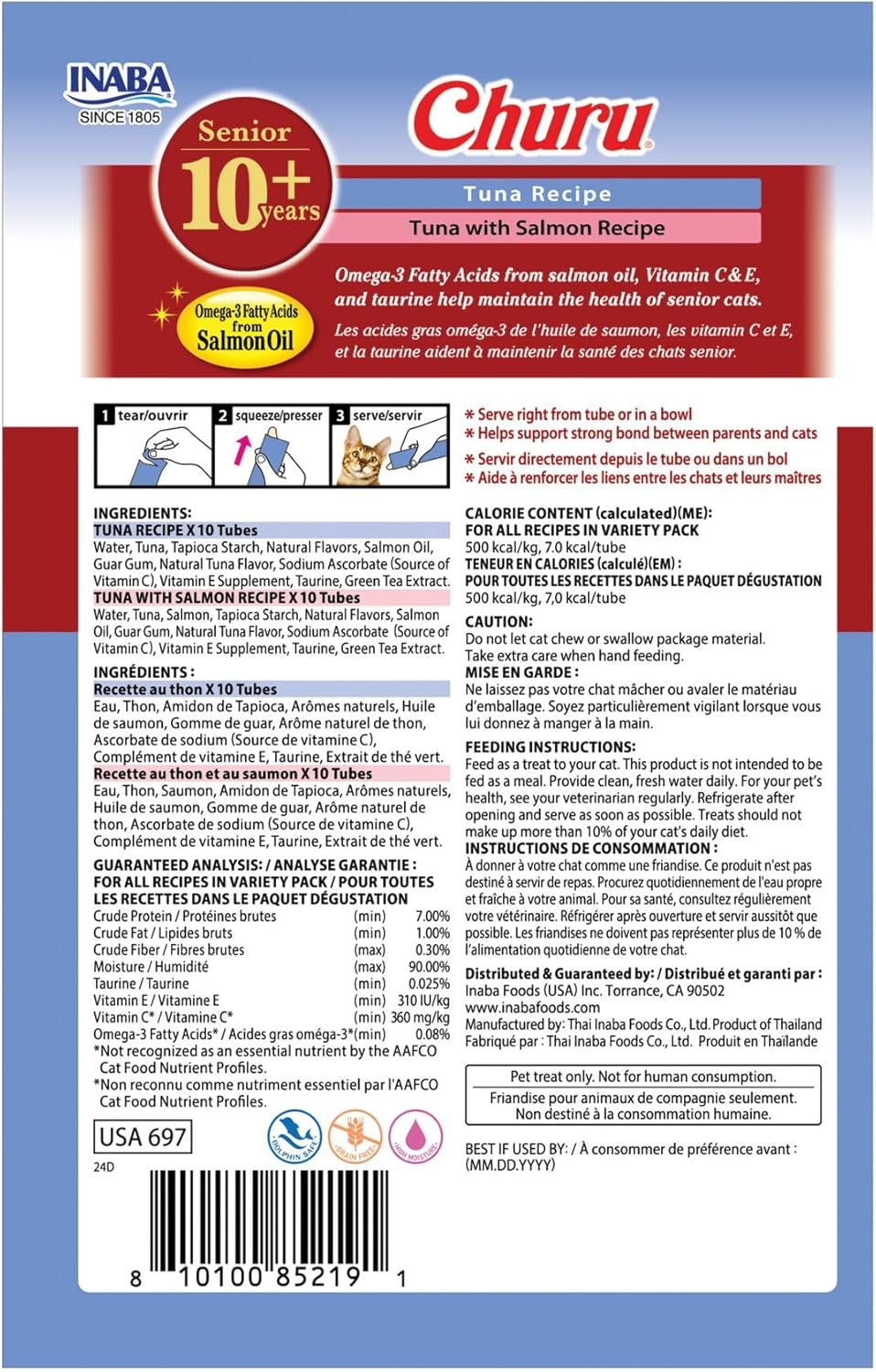 Here at INABA, we know that your cat is a beloved family member. That’s why each of our Churu Treats for Senior Cats 10+ are made from yummy high-quality ingredients, including natural, wild-caught tuna and/or real chicken. As your fur baby ages, hydration becomes even more important. Our Churu for Senior formula has 90% moisture and only 7 calories, which is a tenth of the calories of traditional dry cat treats and 9x the moisture, making these a high-moisture, low-calorie cat snack your kitties will love. To help support healthy aging, we’ve included Omega-3 fatty acids from salmon oil to support brain & cognitive function, as well a healthy skin and coat, Taurine, an essential amino acid, for their overall health, and Vitamin E & C to help boost their immune system. But we’ve kept our cat treats free from grains, preservatives and artificial colors, making them a cat treat you can feel good about feeding. Designed to be hand fed as an interactive way to bond with your cat, you can also squeeze the creamy puree onto a plate/bowl as a tasty dry cat food topper or to disguise medications. Available in four of our most popular Churu flavors, including Tuna Recipe, Tuna with Salmon Recipe, Chicken with Cheese Recipe (variety boxes only), and Chicken Recipe. INABA makes snack time fun for you and you feline friends.