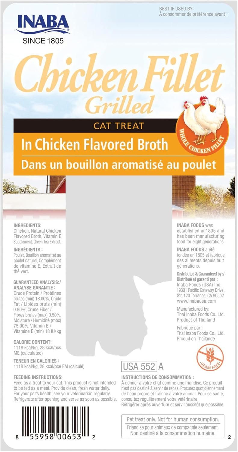 INABA Premium Hand-Cut Grilled Chicken Fillet Cat Treats/Topper with Vitamin E and Green Tea Extract, 25 Grams Each, Pack of 6, Chicken Broth