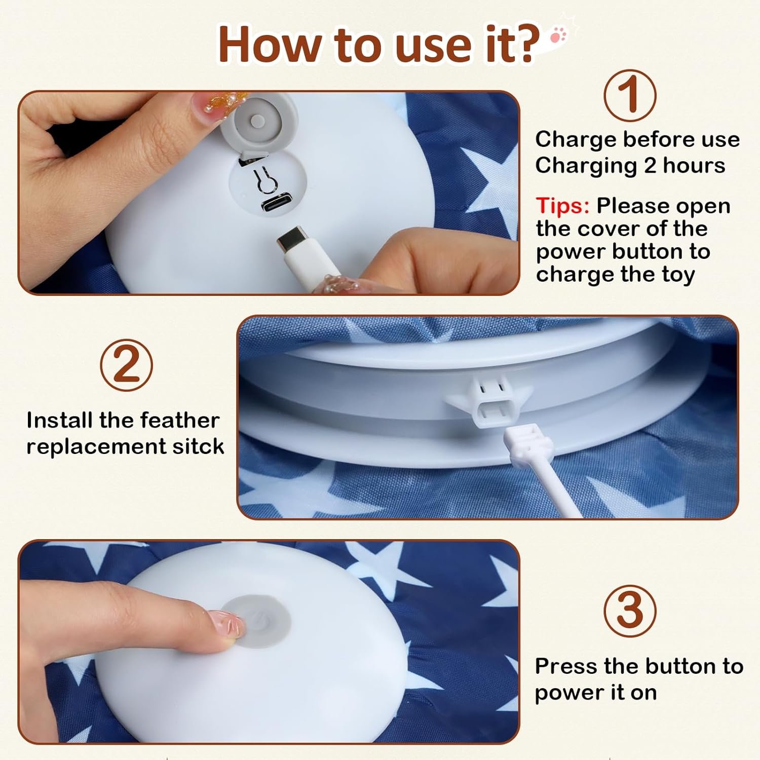 Three speed modes – slow, fast, and interactive—this feather cat toy adapts to a variety of cat play style and suitable for both solo and group play. Hight support this cat toys for bored indoor adult cats