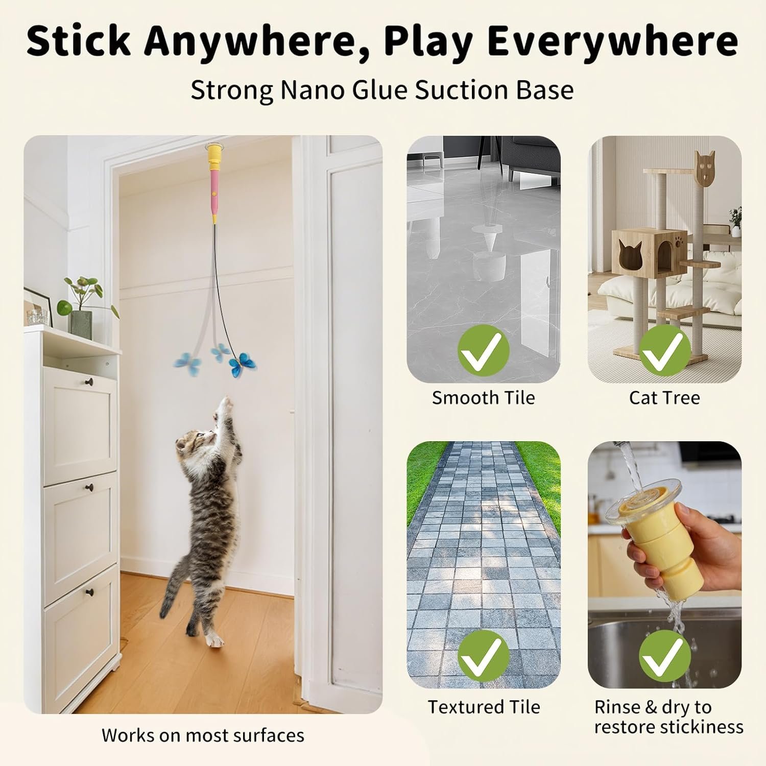 Upgraded Nano Suction Cup: Tired of flimsy suctions? The reusable nano base of this automatic cat wand toy grips walls, glass, or floors firmly, not only for the smooth surfaces. Just rinse and air-dry to restore adhesion, then move it anywhere to enhance cat enrichment and spark curiosity.