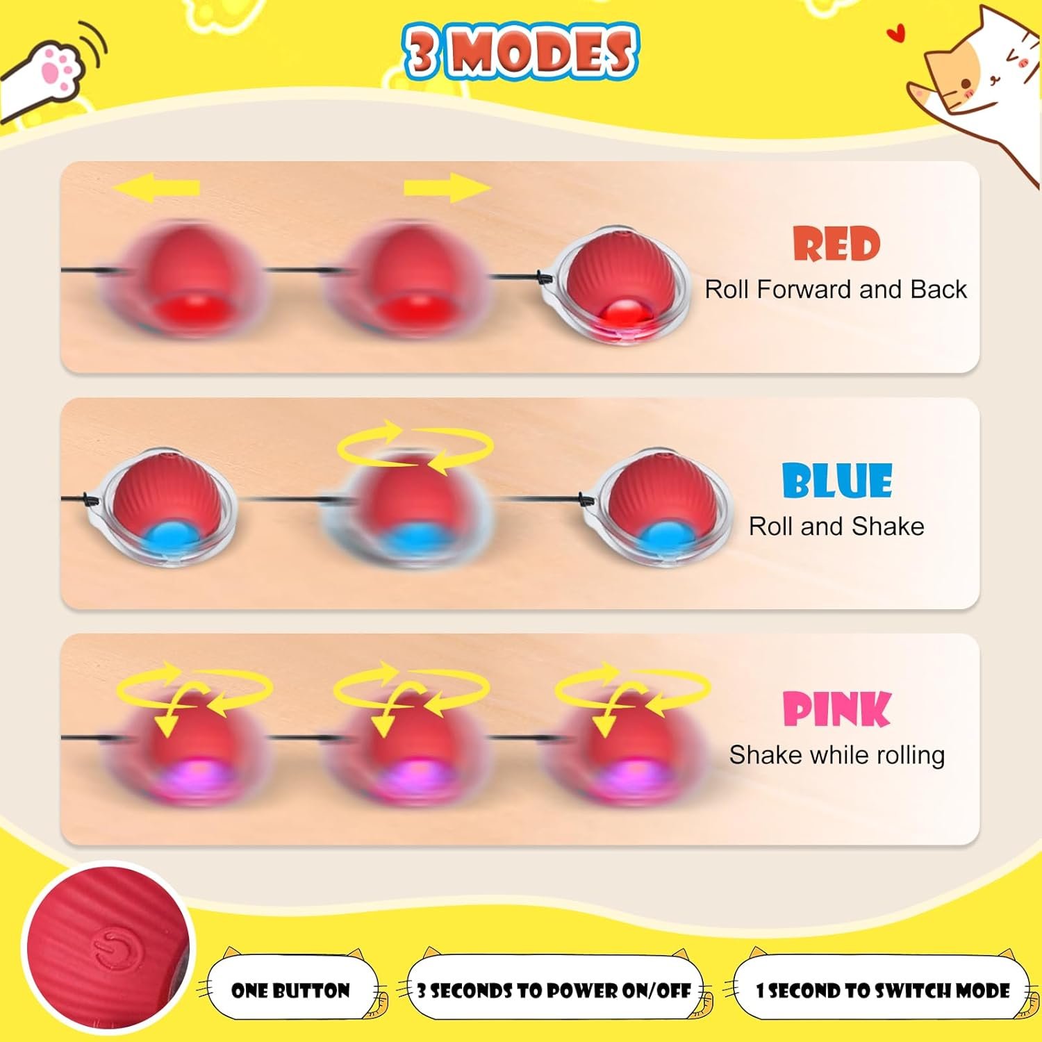 【Smart Motion Activated Cat Toy】Cat ball works 5 minutes and goes into sleep mode if cats aren’t playing with it and wakes up once (after 2h) in while to see if they are now interested. Long press 2s to power on, choose different working mode for cats.