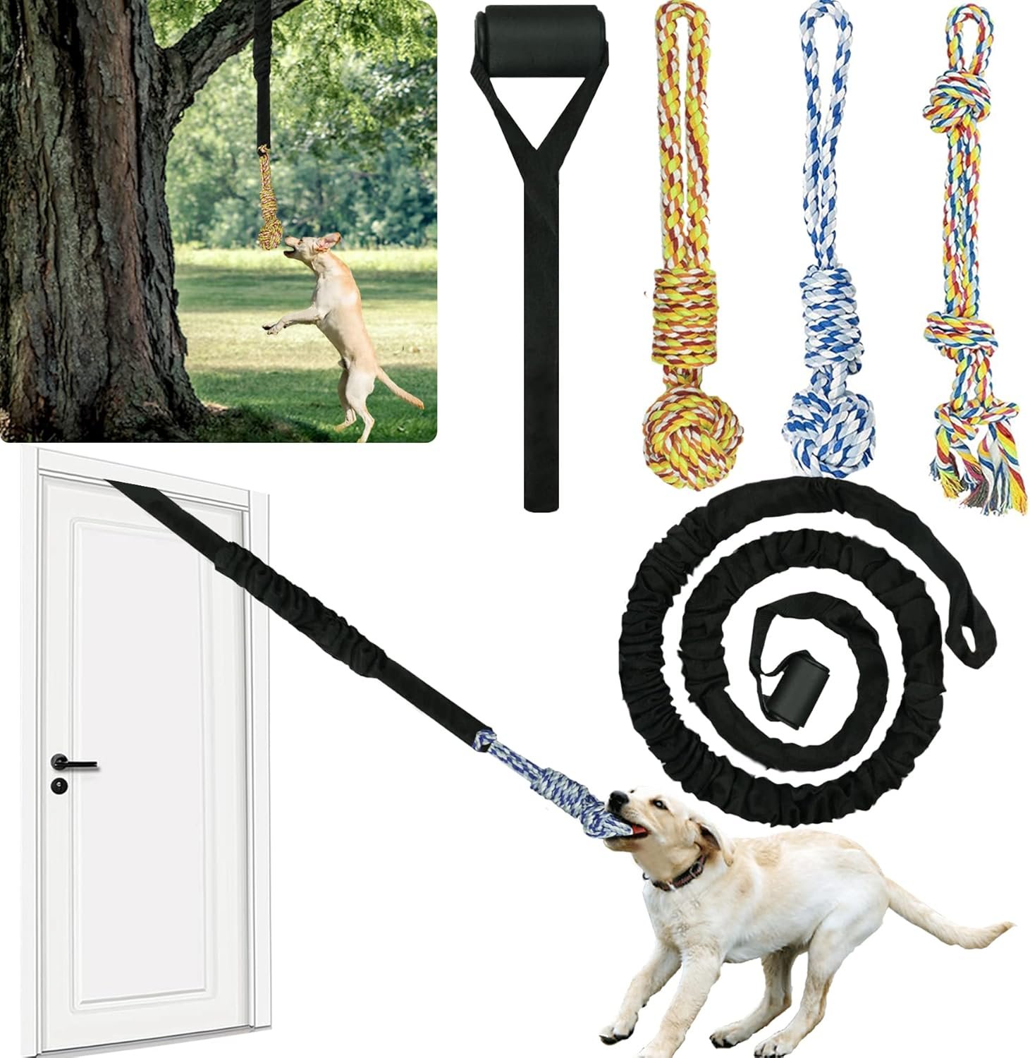 Interactive Dog Bungee Toy Rope Tug War for Pitbull Small Medium Large Dogs, Indoor/Outdoor Tree Hanging Toy for Exercise Solo Play,Spring Pole Interactive Toys with 3 Chew Rope