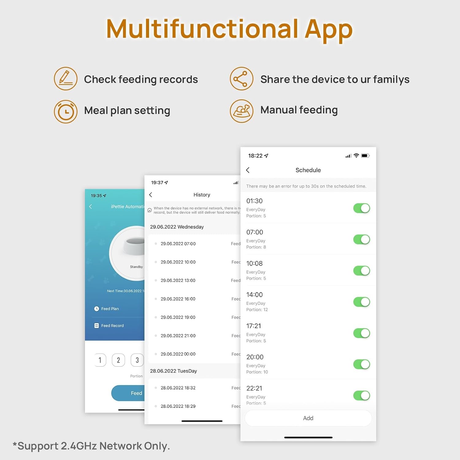 App Control: Feed your pets anytime and anywhere by using the smart control app. Set 1-10 meals per day with 1-12 portions per meal. Track feeding records and share the device with multiple accounts. The auto cat feeder dry food supports 2.4GHz network only.