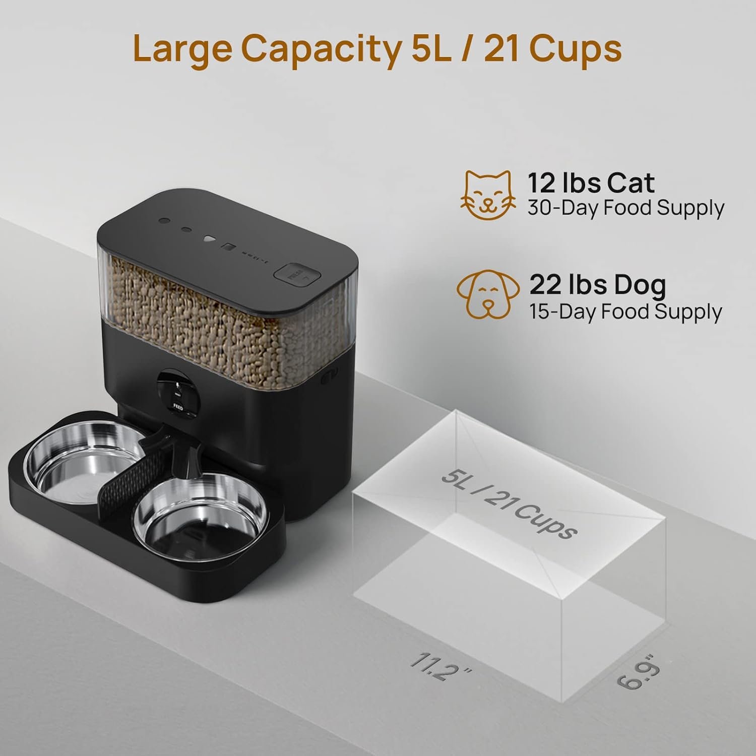 iPettie Automatic Cat Feeder for Two Cats, 2.4G WiFi App Control, 5L/21 Cup Capacity, 1-10 Meals Per Day, Adjustable Bowl Height, Cat Feeder Automatic w/ 2 Stainless Steel Bowls, Voice Recording